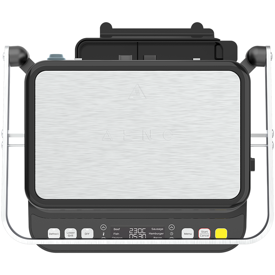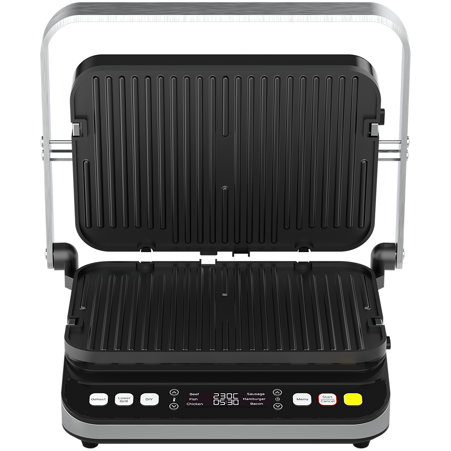Contact grill;220-240V 2000W;Six program for beef, fish, chicken, sausage, humburg, baconReversible grill plate with non-stick coating; Brushed stainless steel housing;Grill plate heating together or heating separately;embossed logo;1M black