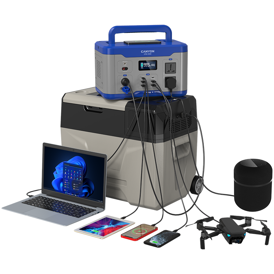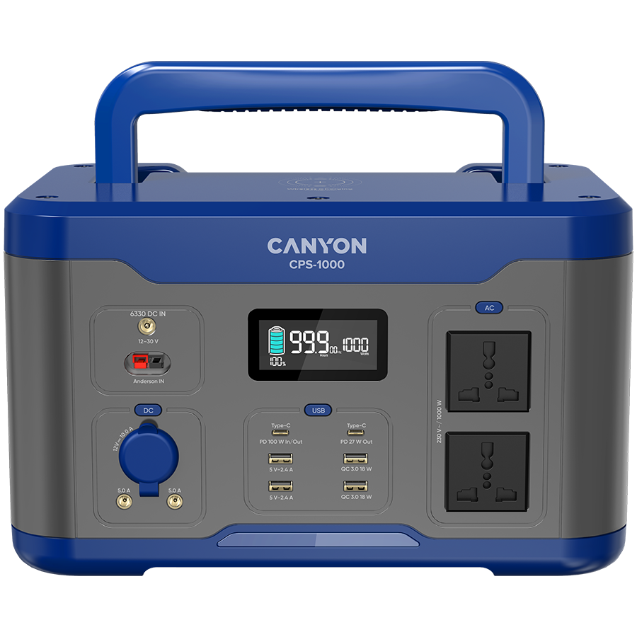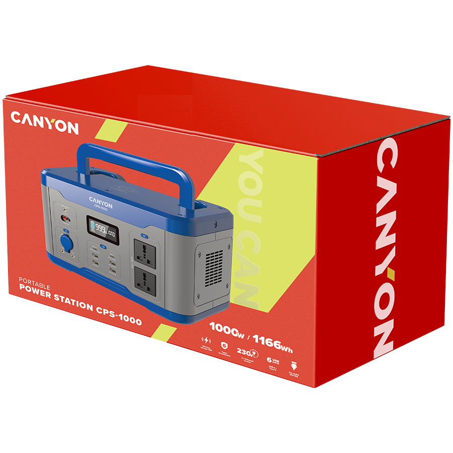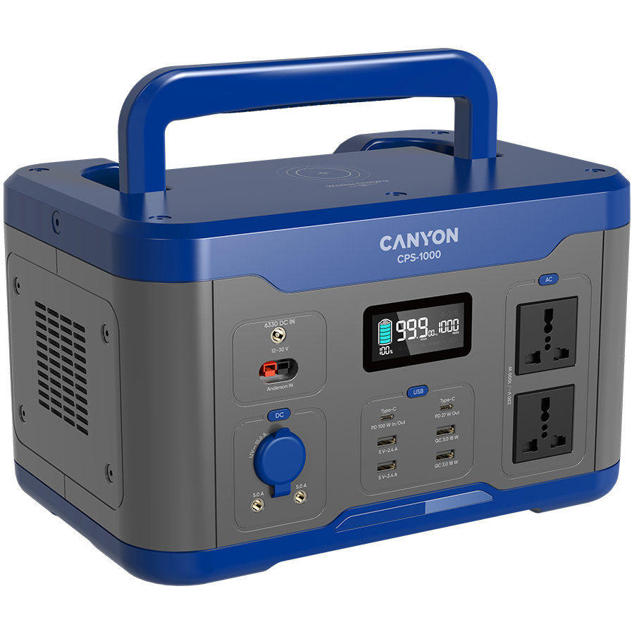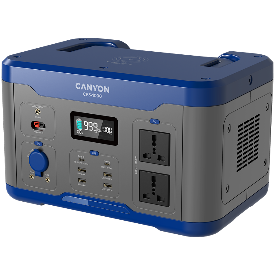 CANYON CPS-1000, 324000mAh 3.6V 1166WH(21700/4500mAh*72)+10W Wireless,USB-C1 Input/Output: PD 100W/ (5V3A/9V3A/12V3A/15V3A/20V5A),USB C2: PD27W(5V 3A/9V2A/12V/2.5A),DC Input: 24V 5A,DC Output:12V/10A (Total),USB-A1:*A2 QC3.0 (5V 3A/9V 2A /12V 1.5A),U