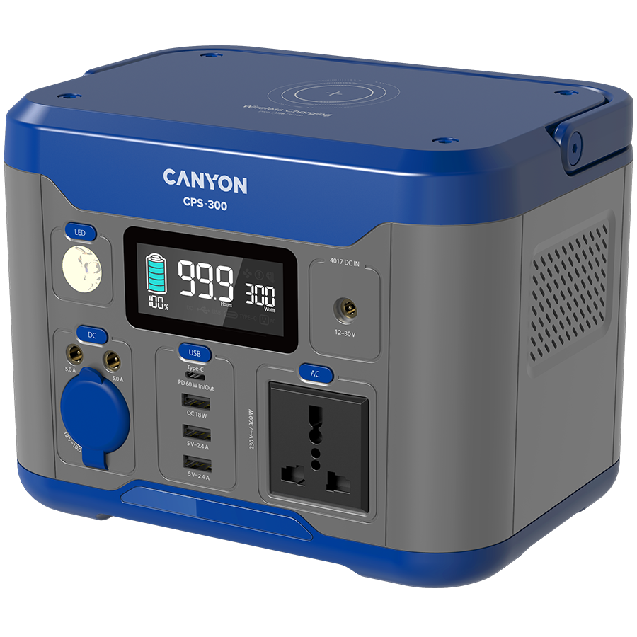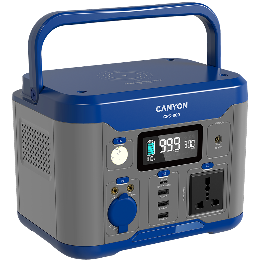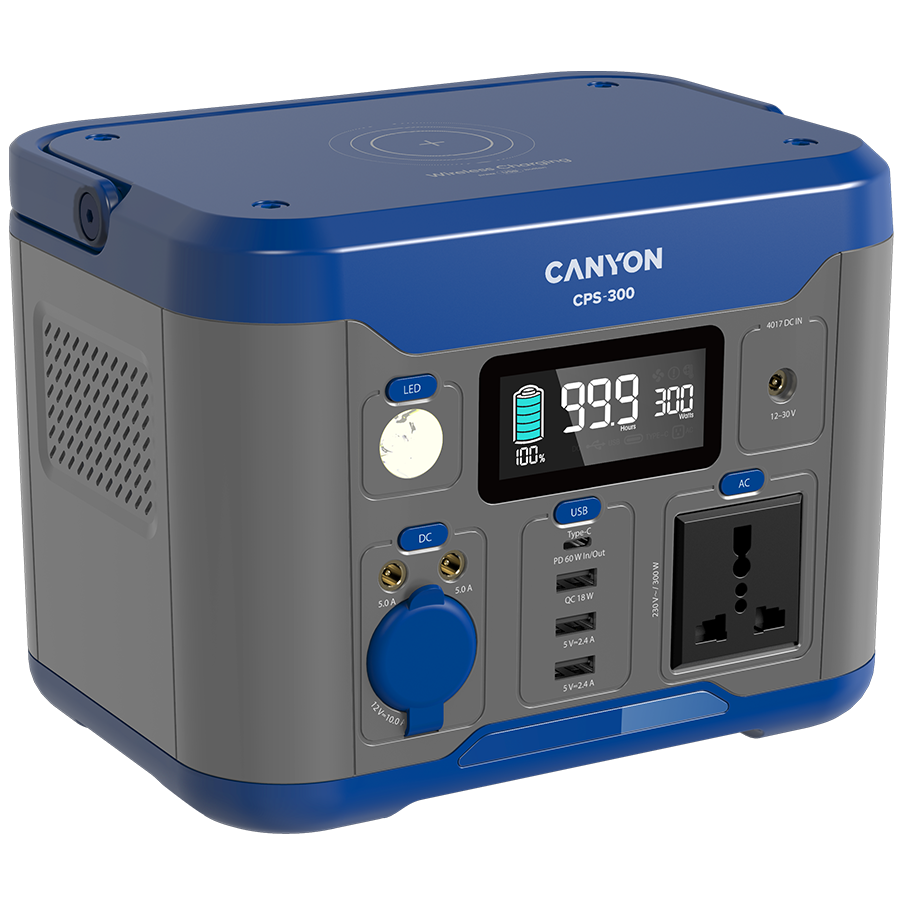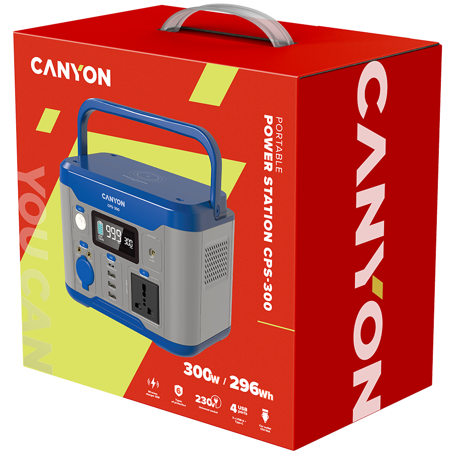 CANYON CPS-300, 80000mAh 3.7V 296WH+10W Wireless, USB-C Input/Output: PD 60W( 5V 3A /9V 3A /12V 3A/15V 3A/20V 3A),DC Input: 19V 3.42A,AC power:300W 230V,DC Output:12V/10A (Total),USB-A1: PD60W(5V 3A /9V 3A /12V 3A/15V 3A/20V 3A),USB-A2 & 3: 5