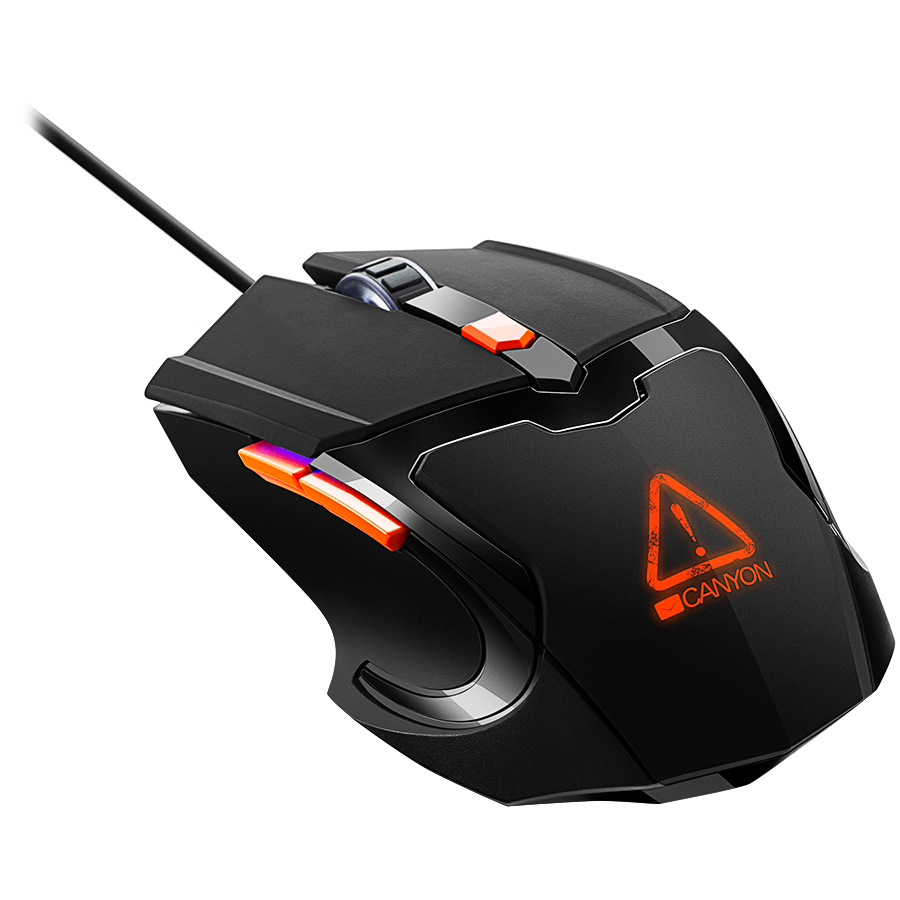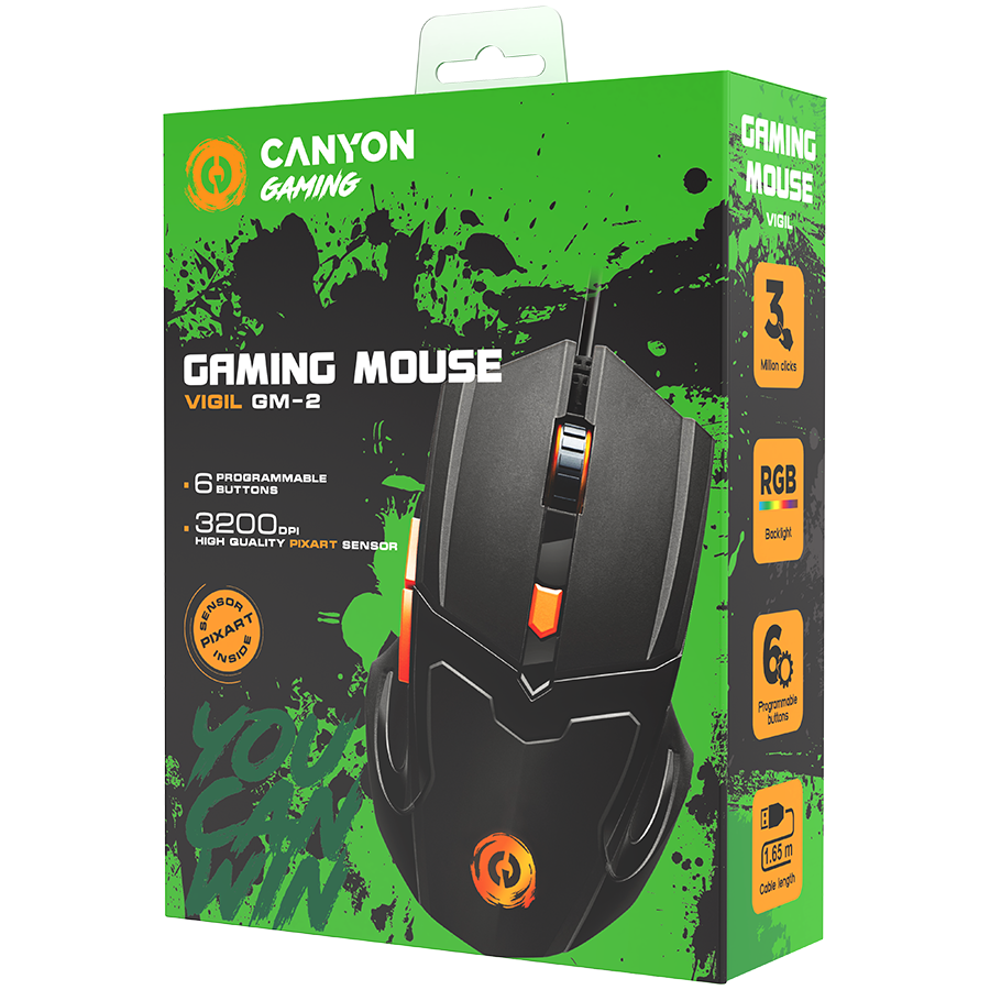 CANYON Vigil GM-2, Optical Gaming Mouse with 6 programmable buttons, Pixart optical sensor, 4 levels of DPI and up to 3200, 3 million times key life, 1.65m PVC USB cable,rubber coating surface and colorful RGB lights, size:125*75*38mm, 140g