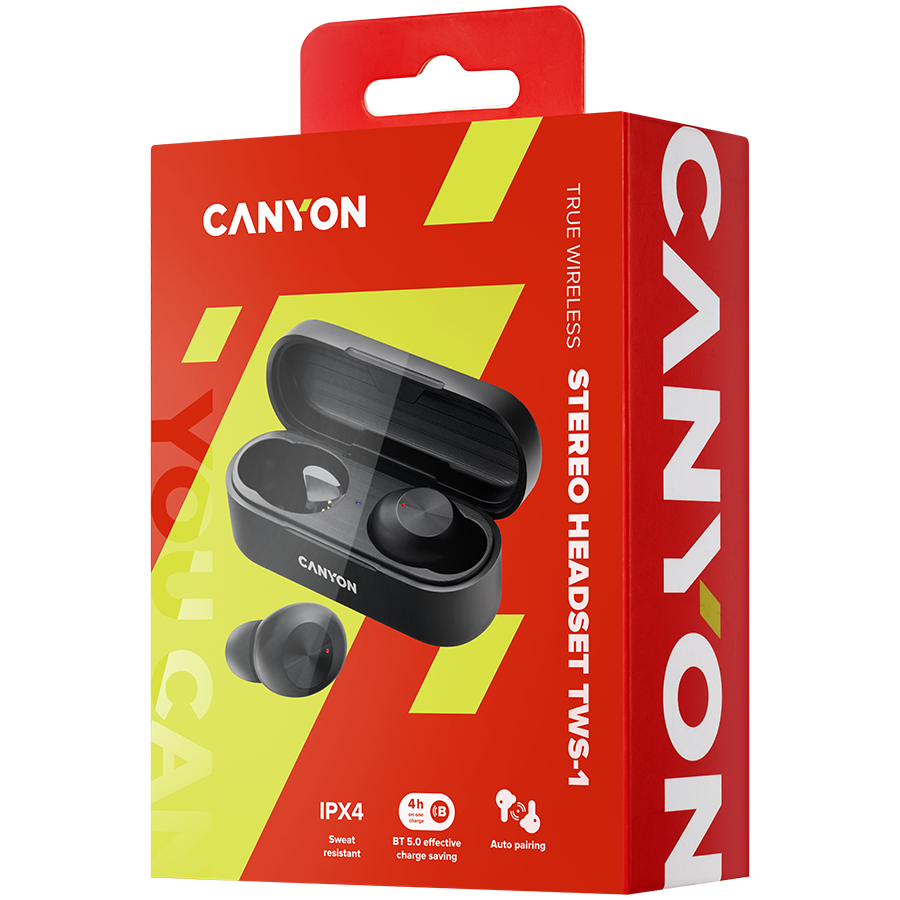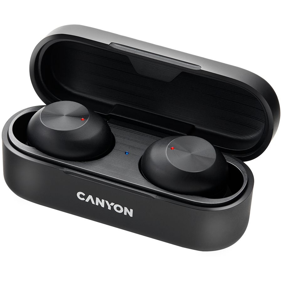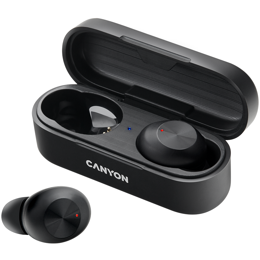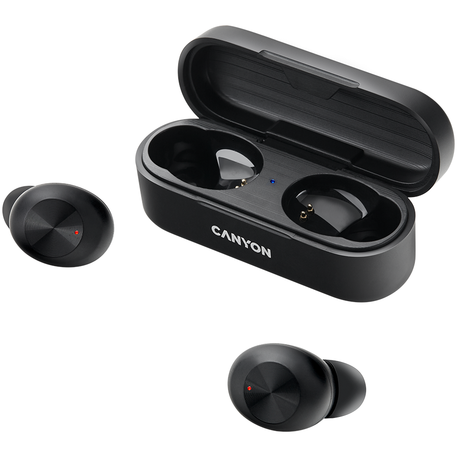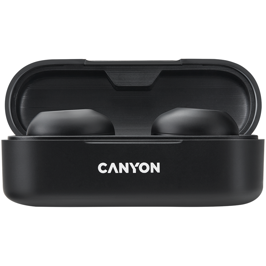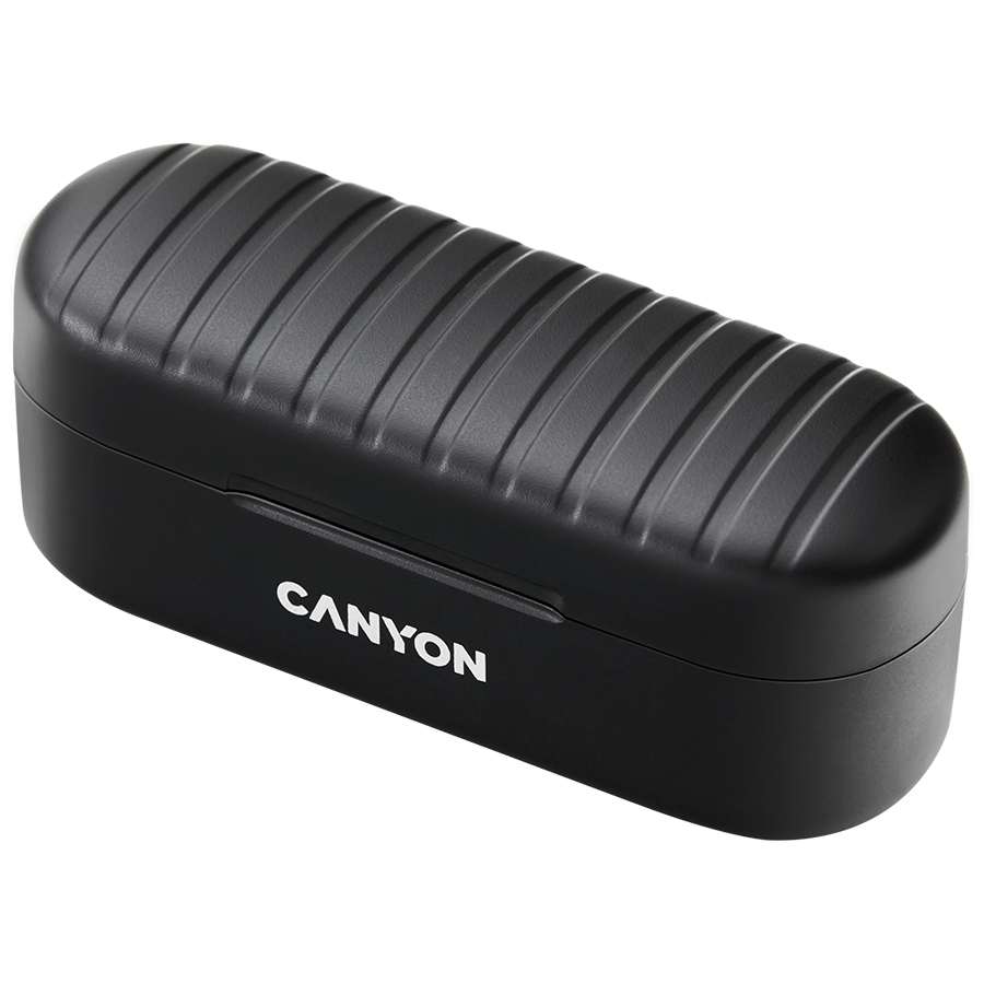 CANYON TWS-1, Bluetooth headset, with microphone, BT V5.0, Bluetrum AB5376A2, battery EarBud 45mAh*2+Charging Case 300mAh, cable length 0.3m, 66*28*24mm, 0.04kg, Black