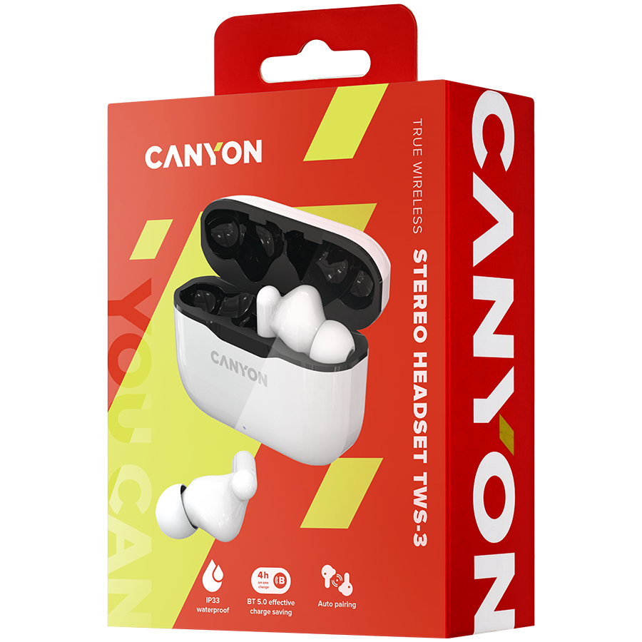 CANYON TWS-3, Bluetooth headset, with microphone, BT V5.0, Bluetrum AB5376A2, battery EarBud 40mAh*2+Charging Case 300mAh, cable length 0.3m, 62*22*46mm, 0.046kg, White