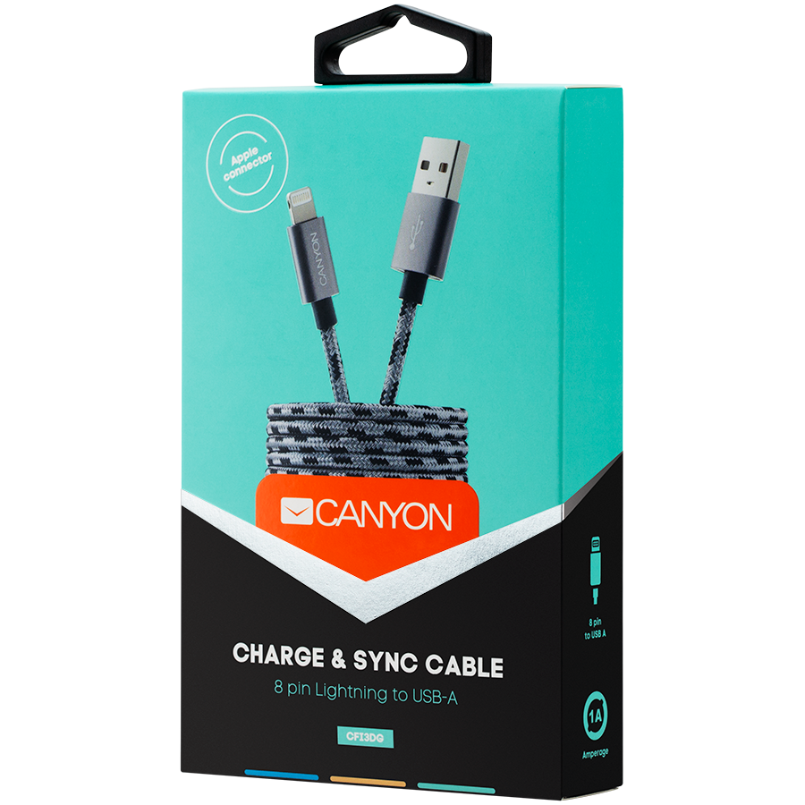 CANYON CFI-3 Lightning USB Cable for Apple, braided, metallic shell, cable length 1m, Dark gray, 14.9*6.8*1000mm, 0.02kg