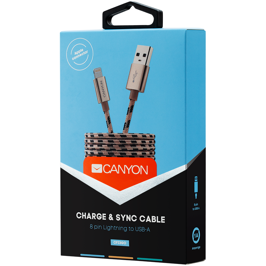 CANYON CFI-3 Lightning USB Cable for Apple, braided, metallic shell, cable length 1m, Gold, 14.9*6.8*1000mm, 0.02kg