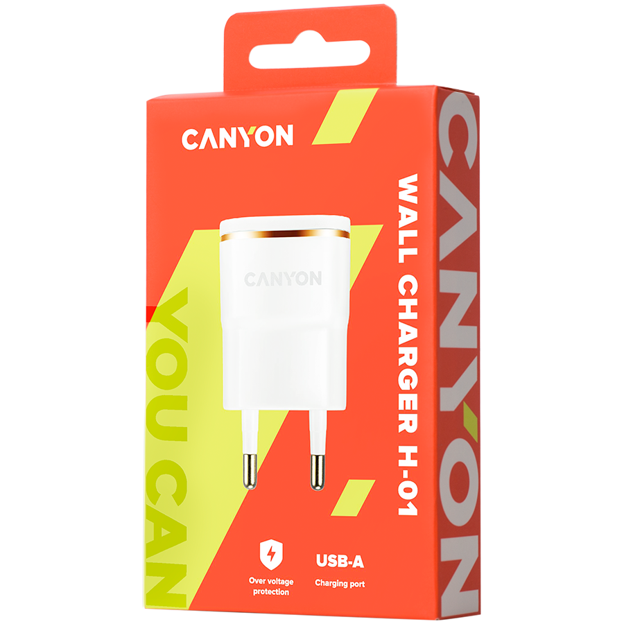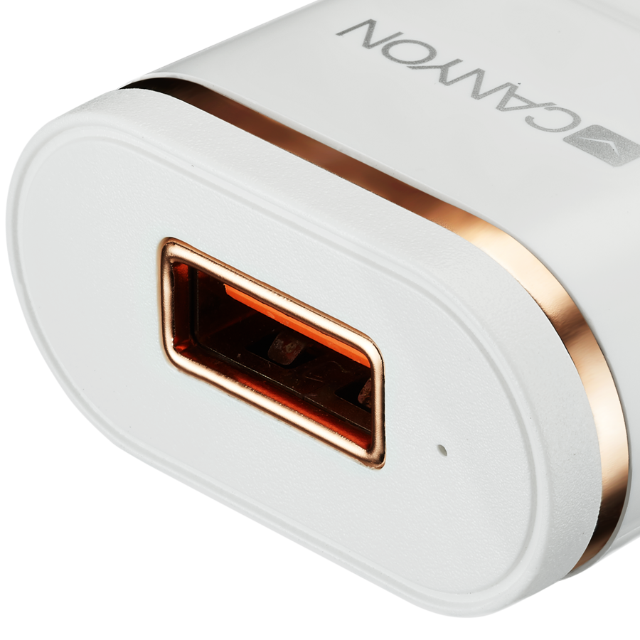 CANYON H-01 Universal 1xUSB AC charger (in wall) with over-voltage protection, Input 100V-240V, Output 5V-1A, white glossy plastic + rose-gold stripe, 64.5*36.2*18.6mm, 0.023kg