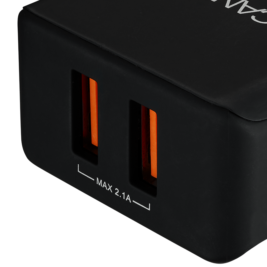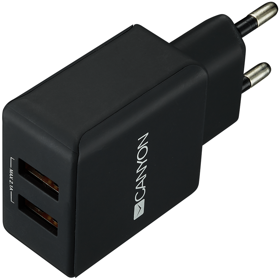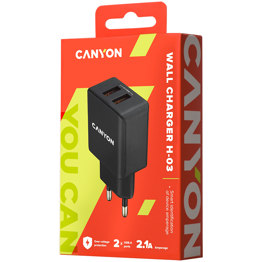 CANYON H-03, Universal 2xUSB AC charger (in wall) with over-voltage protection, Input 100V-240V, Output 5V-2.1A, with Smart IC, black rubber coating with side parts+glossy with other parts, 80*42.5*23.8mm, 0.042kg