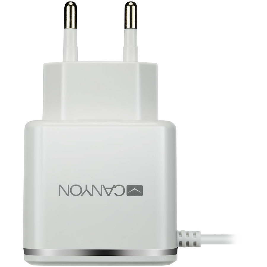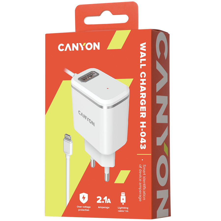 CANYON H-043 Universal 1xUSB AC charger (in wall) with over-voltage protection, plus lightning USB connector, Input 100V-240V, Output 5V-2.1A, with Smart IC, white(silver electroplated stripe), cable length 1m, 81*47.2*27mm, 0.059kg