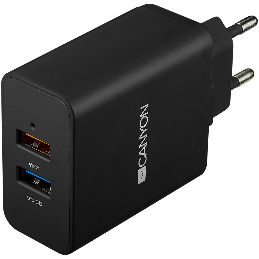 CANYON H-07 Universal 2xUSB AC charger (in wall) with over-voltage protection(1 USB with Quick Charger QC3.0), Input 100V-240V, Output USB/5V-2.4A+QC3.0/5V-2.4A&9V-2A&12V-1.5A, with Smart IC, Black rubber coating+QC3.0 port in blue/ot