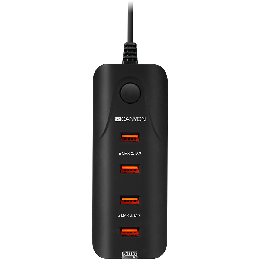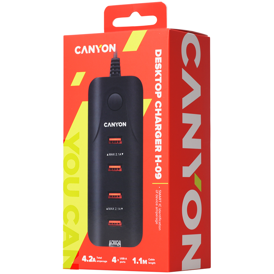 CANYON H-09, Universal 4xUSB AC charger (in wall) with over-voltage protection, Input 100V-240V, Output 5V-4.2A, with Smart IC, Black rubber coating+ orange plastic part of USB, 127.7*50*24.5mm, 0.126kg