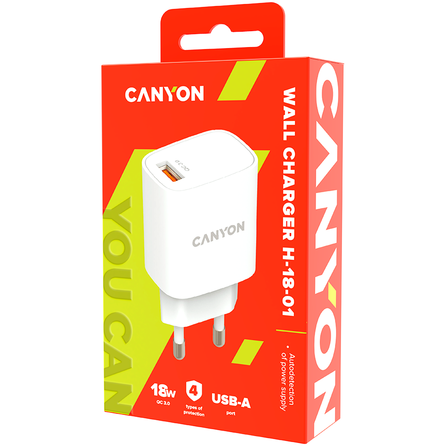 CANYON H-18-01, Wall charger with 1*USB, QC3.0 18W, Input: 100V-240V, Output: DC 5V/3A,9V/2A,12V/1.5A, Eu plug, OCP/OVP/OTP/SCP, CE, RoHS ,ERP. Size: 80.17*41.23*28.68mm, 50g, White