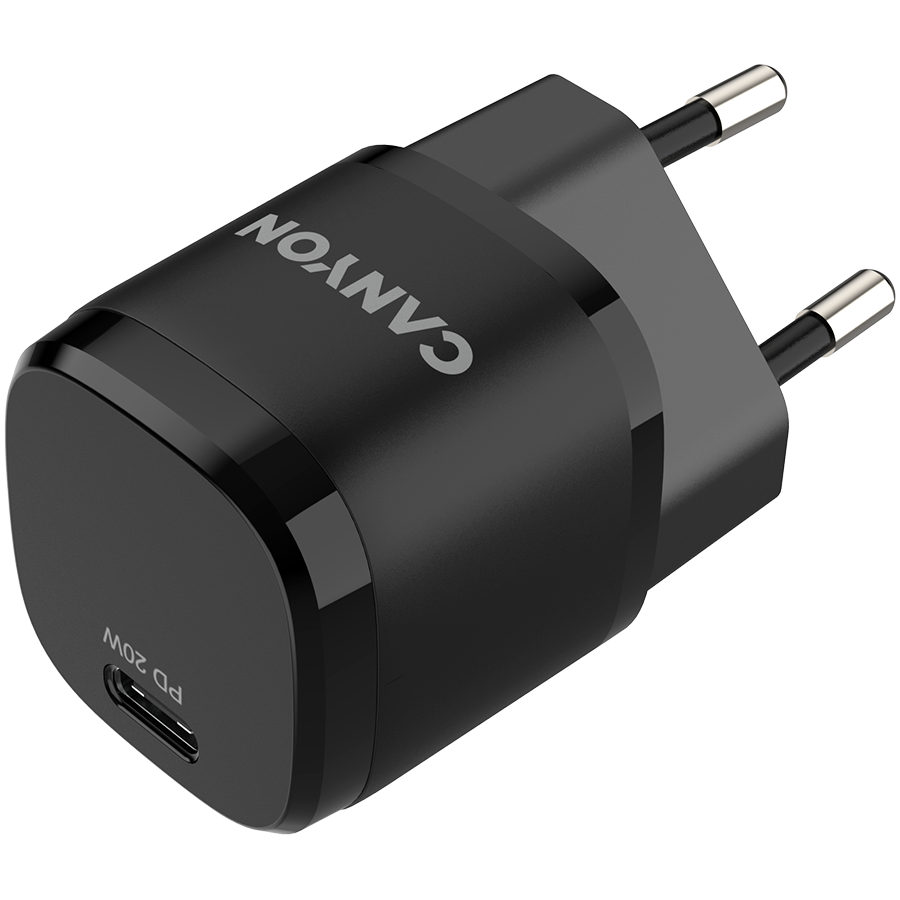 CANYON H-20-05, PD 20W Input: 100V-240V, Output: 1 port charge: USB-C:PD 20W (5V3A/9V2.22A/12V1.66A) , Eu plug, Over- Voltage , over-heated, over-current and short circuit protection Compliant with CE RoHs,ERP. Size: 68.5*29.2*29.4mm, 32.5g, Black