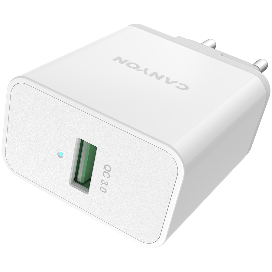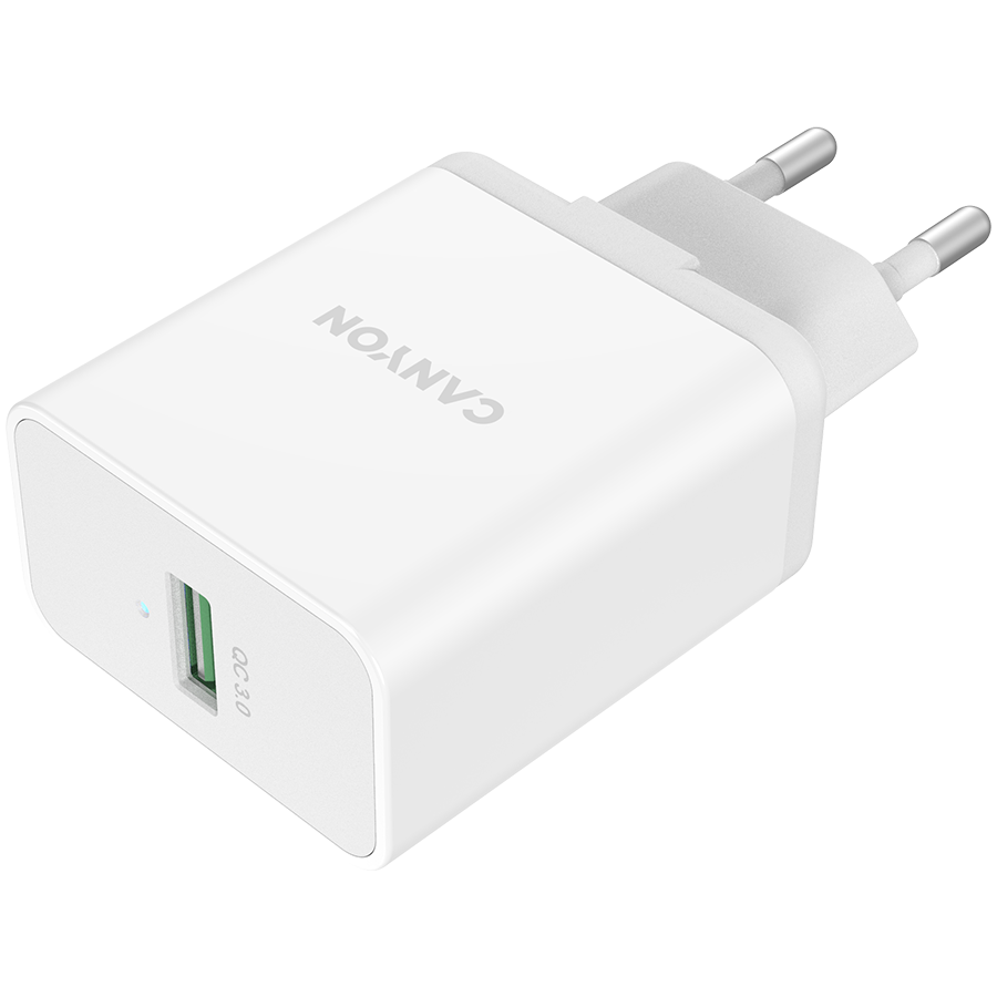 CANYON H-24, Wall charger with 1*USB, QC3.0 24W, Input: 100V-240V, Output: DC 5V/3A,9V/2.67A,12V/2A, Eu plug, Over-load, over-heated, over-current and short circuit protection, CE, RoHS ,ERP. Size:89*46*26.5 mm,58g, White