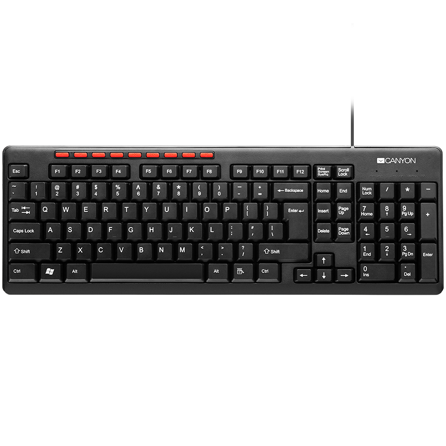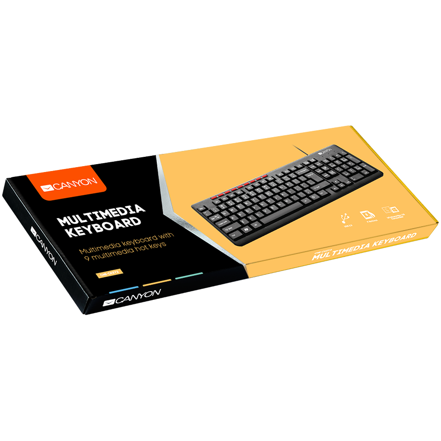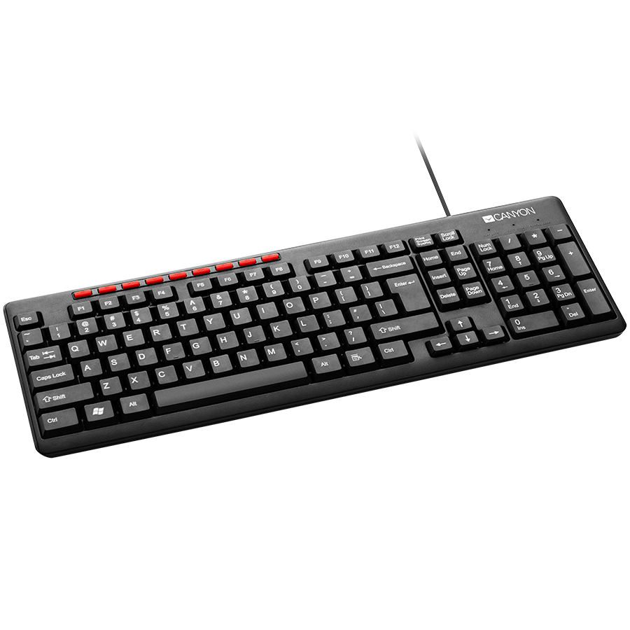 CANYON Wired Keyboard, slim, 116 keys with Multimedia functions, USB2.0, Black, cable length 1.3m, 445*160*24mm, 0.46kg, Russian