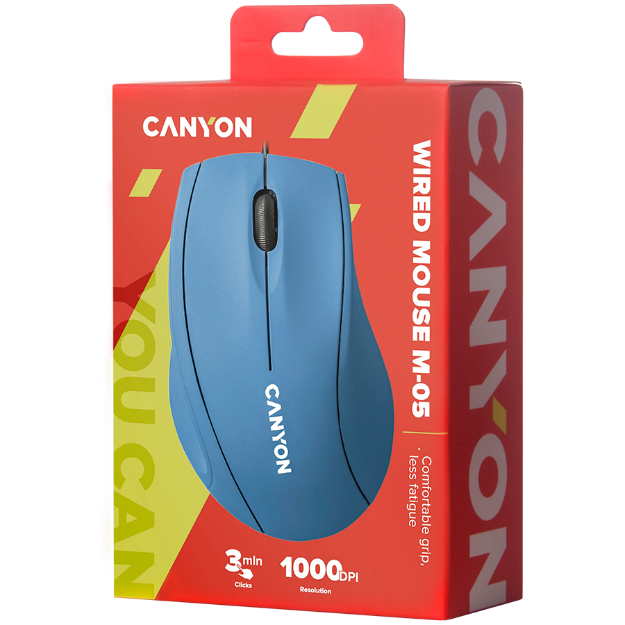 CANYON M-05, Wired Optical Mouse with 3 keys, DPI 1000 With 1.5M USB cable,Light Blue,size 72*108*40mm,weight:0.077kg