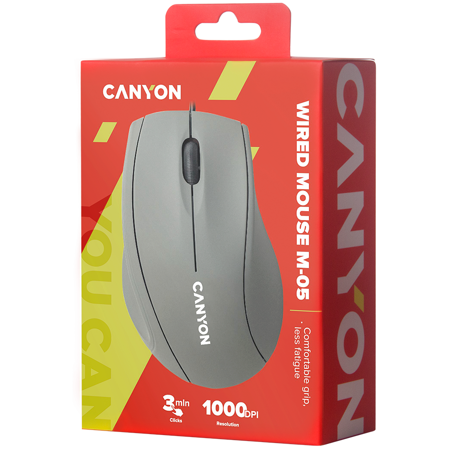CANYON M-05, Wired Optical Mouse with 3 keys, DPI 1000 With 1.5M USB cable,Grey,size72*108*40mm,weight:0.077kg