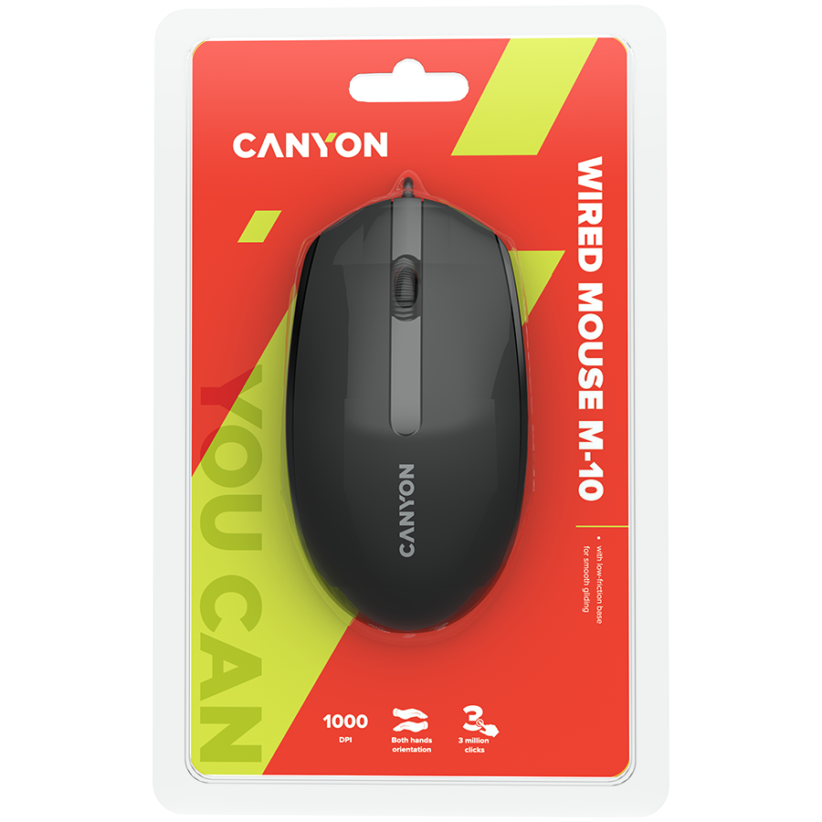 CANYON M-10, Canyon Wired optical mouse with 3 buttons, DPI 1000, with 1.5M USB cable, black, 65*115*40mm, 0.1kg