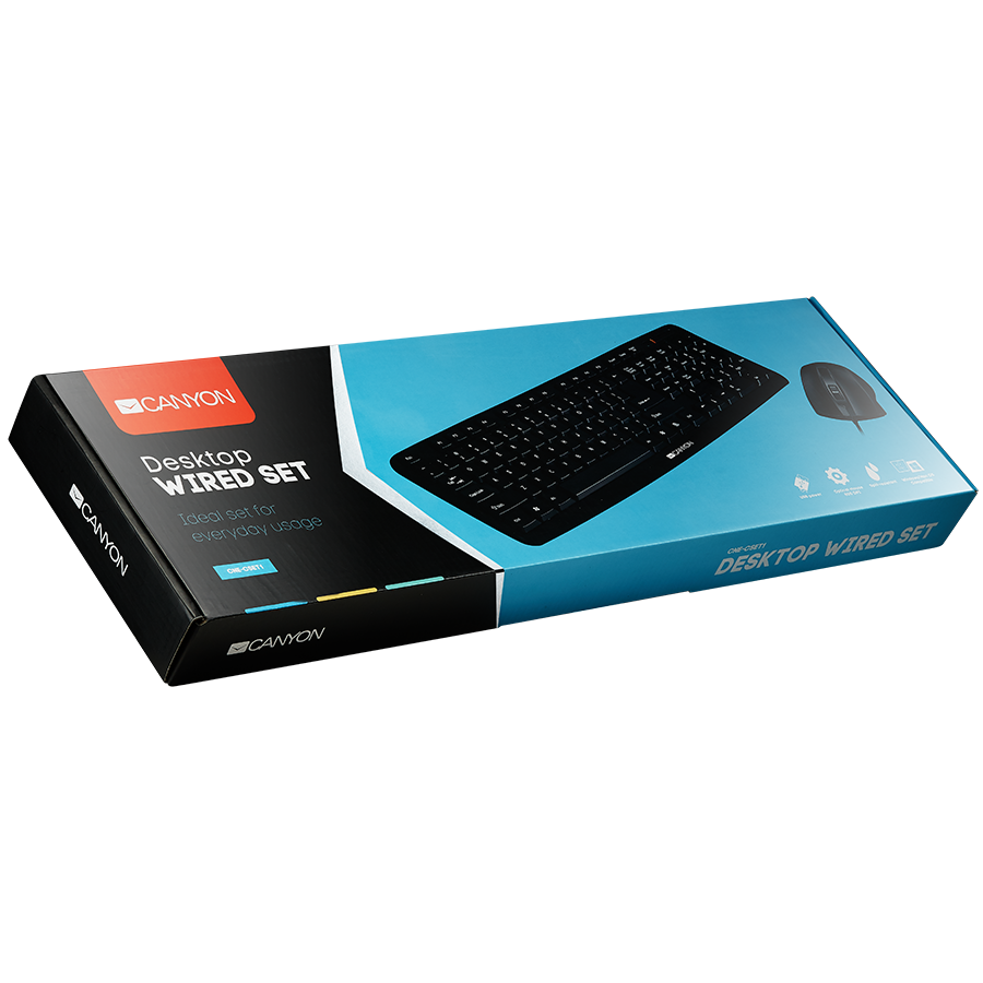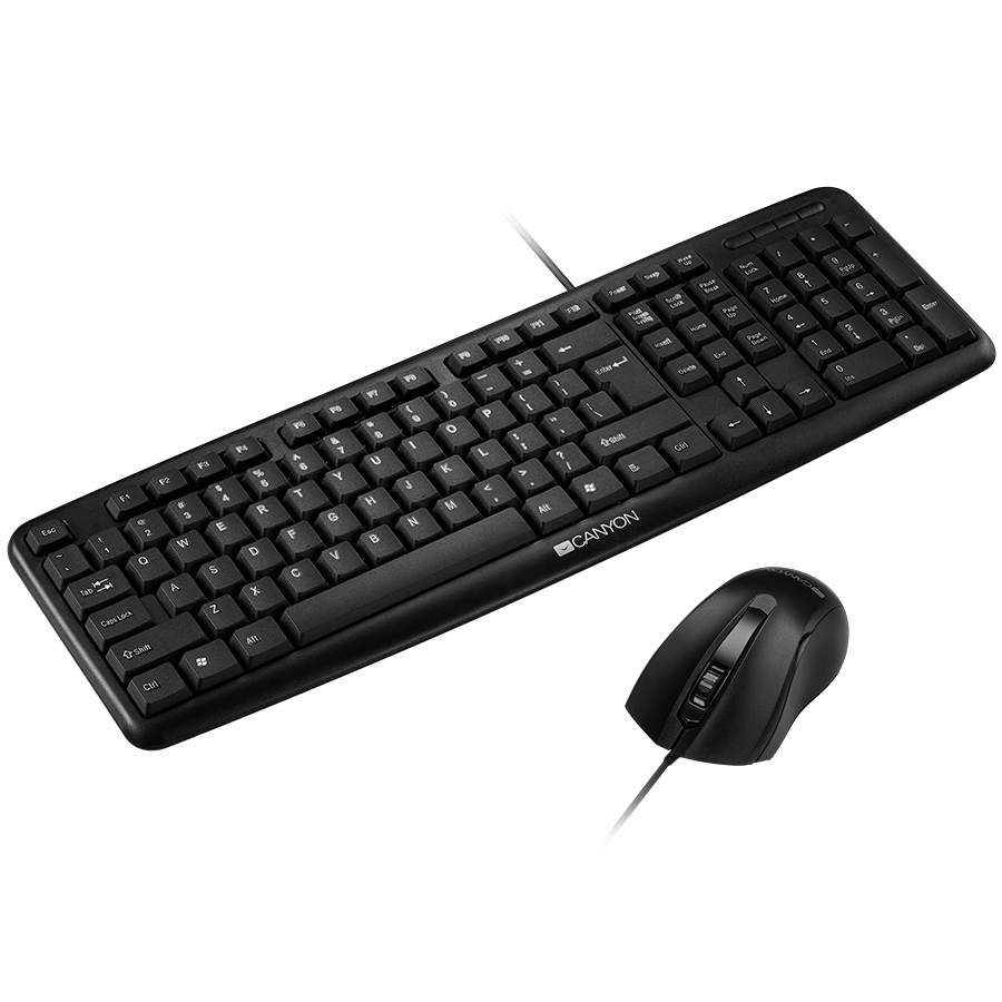 CANYON SET-1, CANYON USB standard KB, 104 keys, water resistant RU layout bundle with optical 3D wired mice 1000DPI,USB2.0, Black, cable length 1.8m(KB)/1.8m(MS), 443*145*24mm(KB)/115.3*63.5*36.5mm(MS), 0.44kg