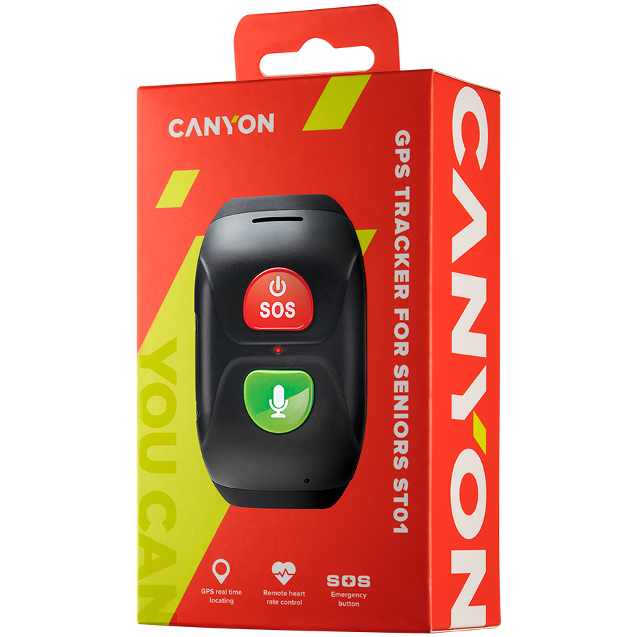 CANYON ST-01, Senior Tracker, GPS function, SOS button, IP67 waterproof, single SIM, 16KB RAM 512KB ROM, GSM(850/900/1800/1900MHz), 400mAh, compatibility with iOS and android, Black, host: 66*37*16mm, strap: 20wide*240mm, 48g