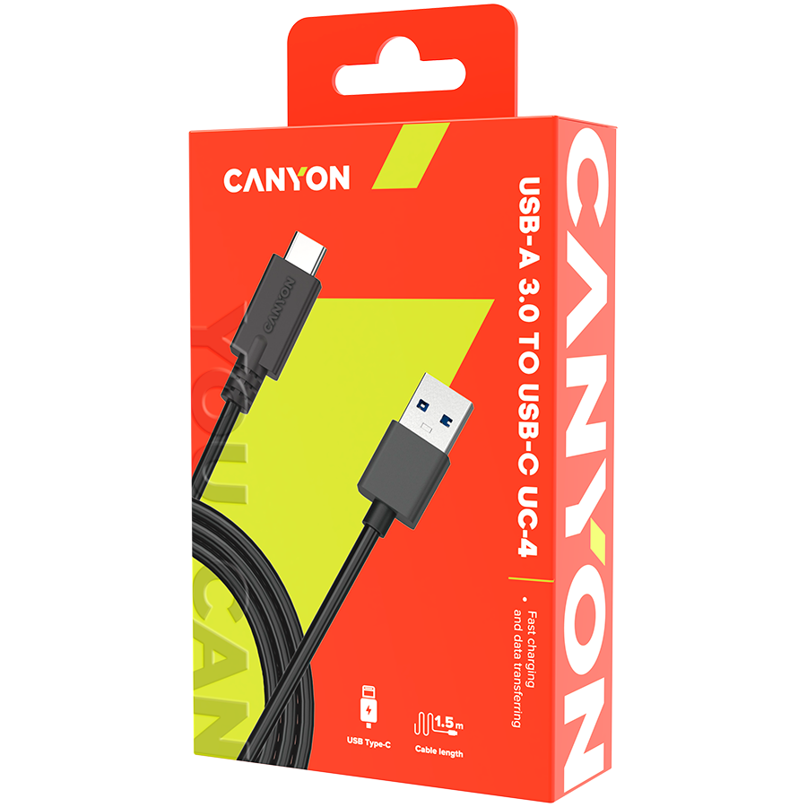 CANYON UC-4, Type C USB 3.0 standard cable, Power & Data output, 5V 3A 15W, OD 4.5mm, PVC Jacket, 1.5m, black, 0.039kg