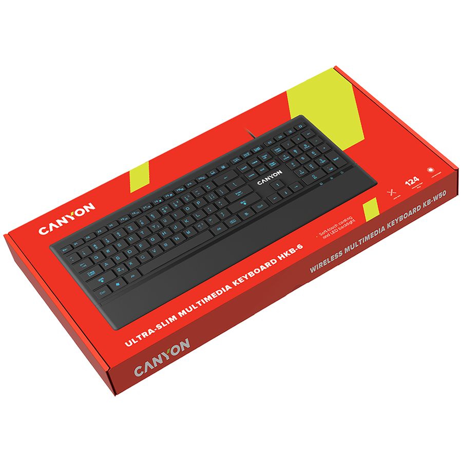 CANYON HKB-6, Stylish slim USB multimedia keyboard, LED backlight, 111 keys, Black, cable length 1.58m, 431*178*11.85, 0.71kg, RU layout