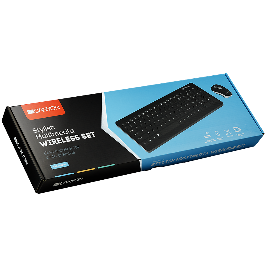 CANYON 2.4GHz wireless combo-set, keyboard 105 keys, chocolate key caps, RU layout (black); mouse adjustable DPI 800/1200/1600, 3 buttons (black). 393*150*20mm(KB)/26.37*17.6mm(MS), 0.332kg