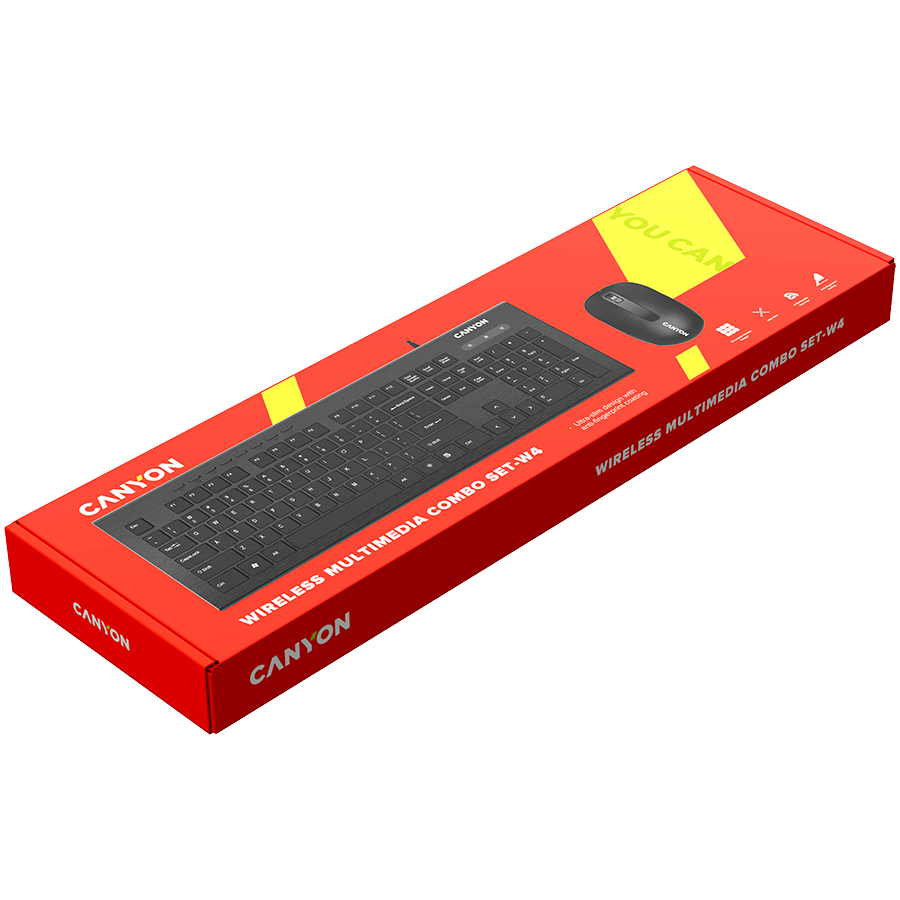 CANYON SET-W4, Multimedia 2.4GHz wireless combo-set, keyboard 104 keys, slim and brushed finish design, chocolate key caps, US layout (black); mouse adjustable DPI 800/1200/1600, 3 buttons (black). 450*154*22.3mm(KB)/98.7*63.3*34mm(MS), 0.55kg