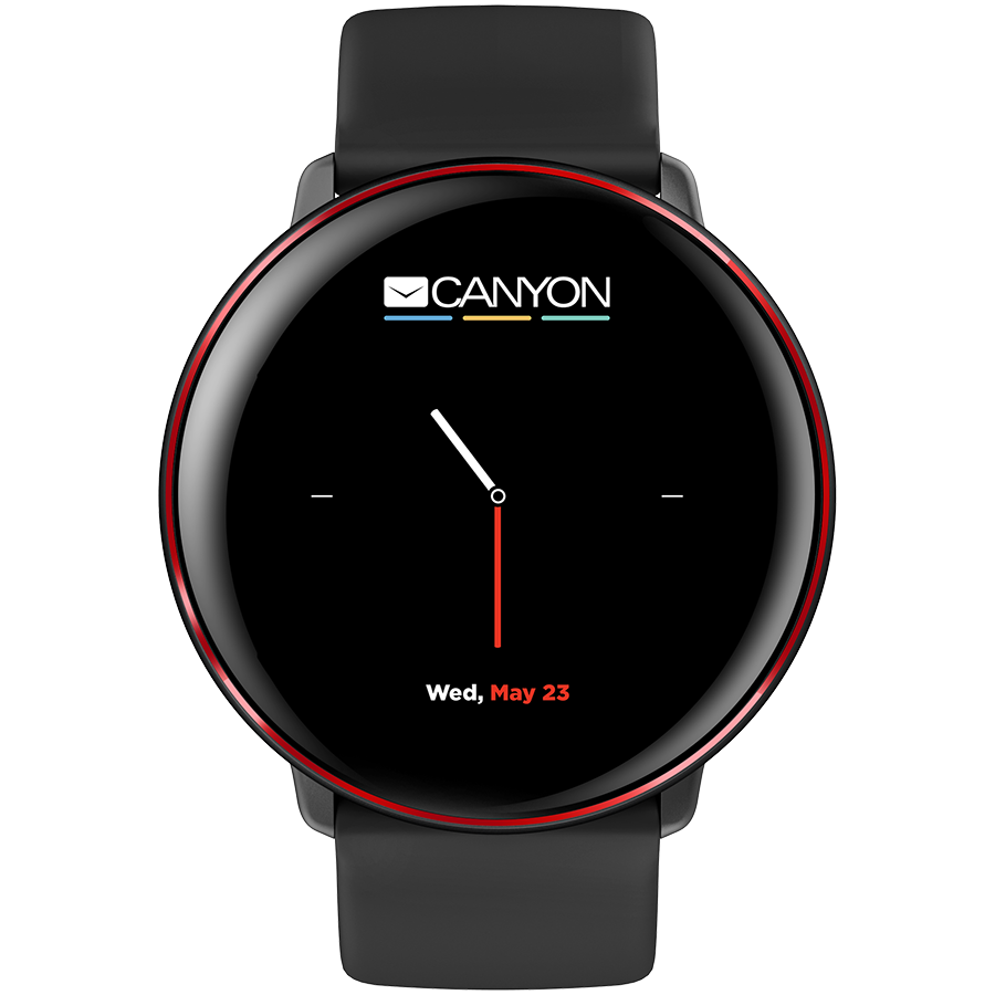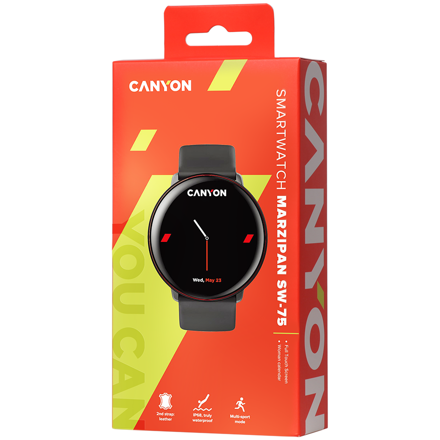 CANYON Marzipan SW-75, Smart watch, 1.22inches IPS full touch screen, aluminium+plastic body,IP68 waterproof, multi-sport mode with swimming mode, compatibility with iOS and android,black-red body with extra black leather belt, Host: 41.5x11.6mm, Str