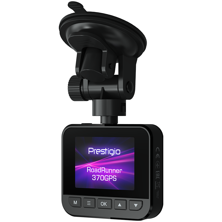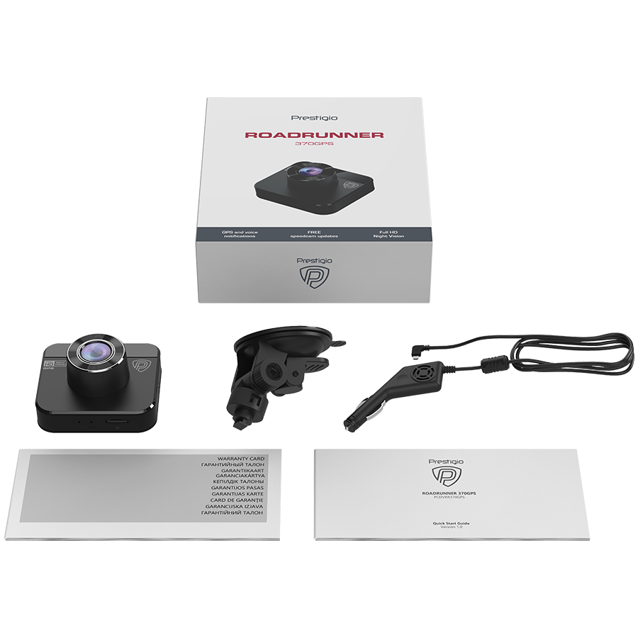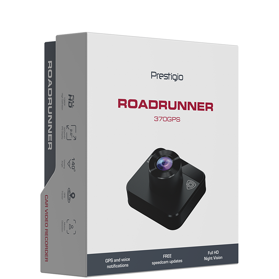 Prestigio RoadRunner 370GPS, 2.0'' IPS (320x240) display, FHD 1920x1080@30fps, HD 1280x720@30fps, AIT8336N, 2 MP CMOS GC2053 image sensor, 2 MP camera, 140° Viewing Angle, Micro USB, 120 mAh battery, GPS, Night Vision, Motion Detection, G-s