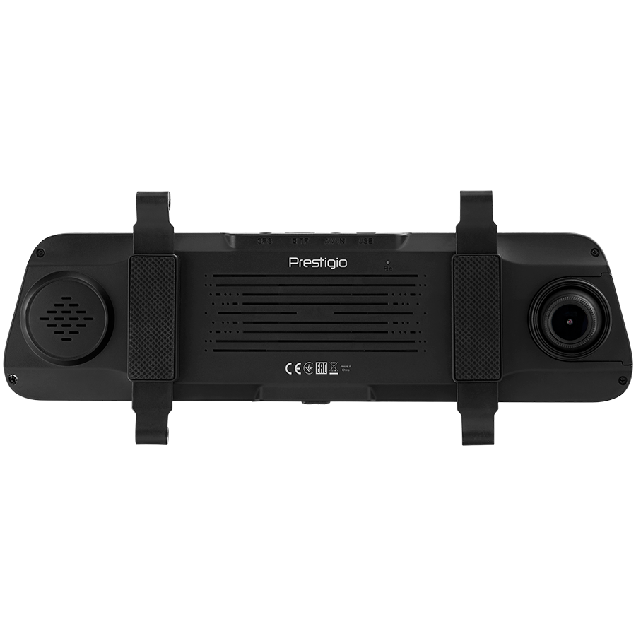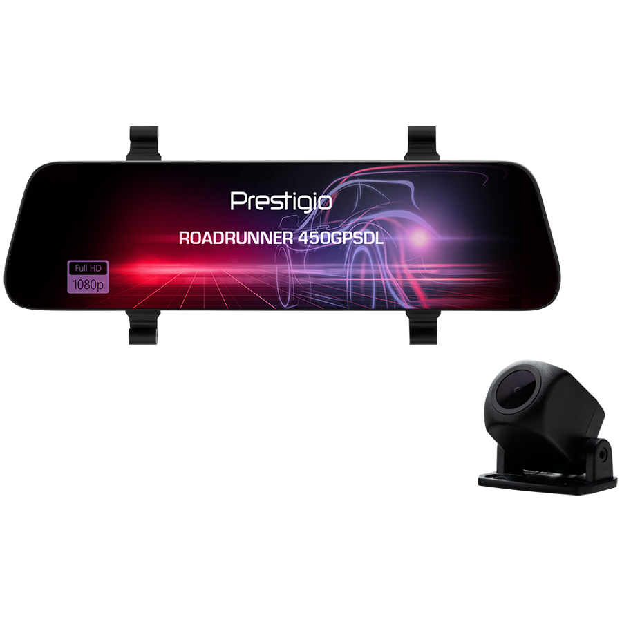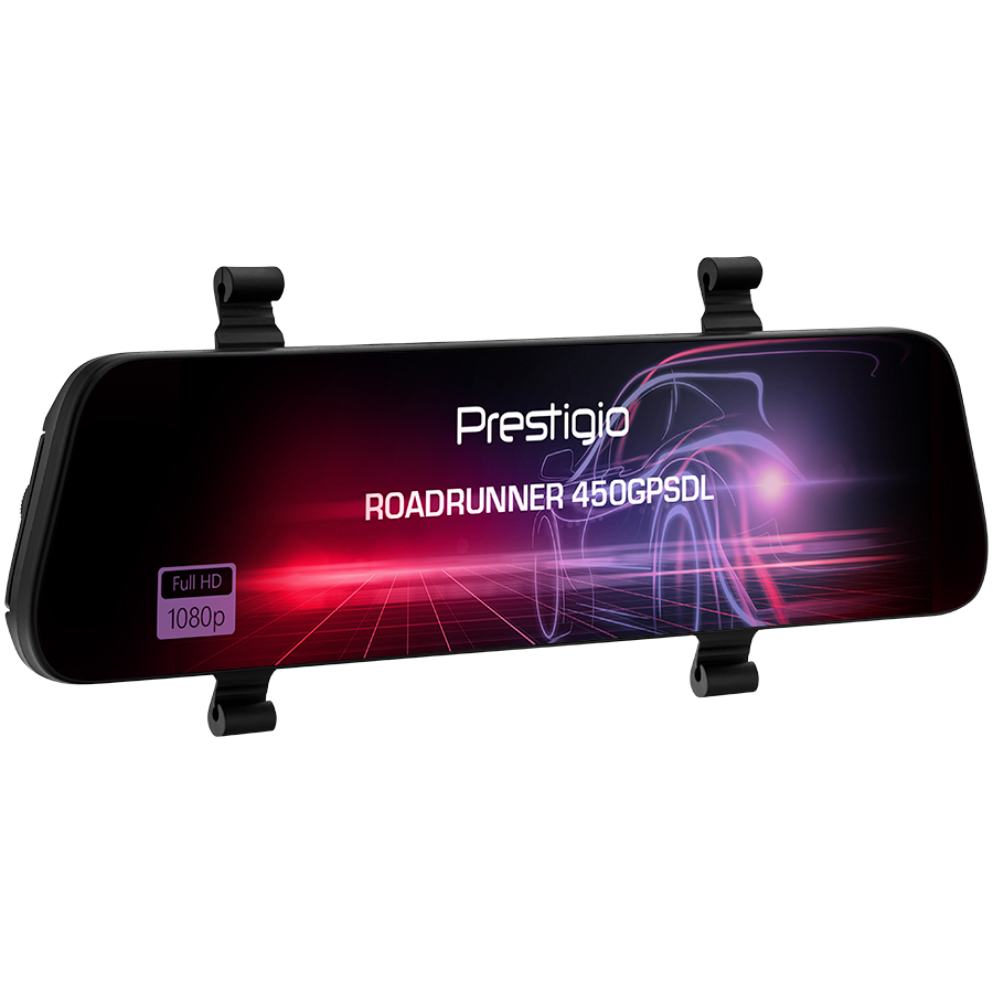 Prestigio RoadRunner 450GPSDL, 9.66'' IPS (1280x320) 2.5D curved touch display, Dual camera: front - FHD 1920x1080@30fps, HD 1280x720@30fps, rear - VGA 1920x1080@30fps, MSC8339D, 2 MP CMOS SC2363 front image sensor, 12 MP camera, 120° Viewi