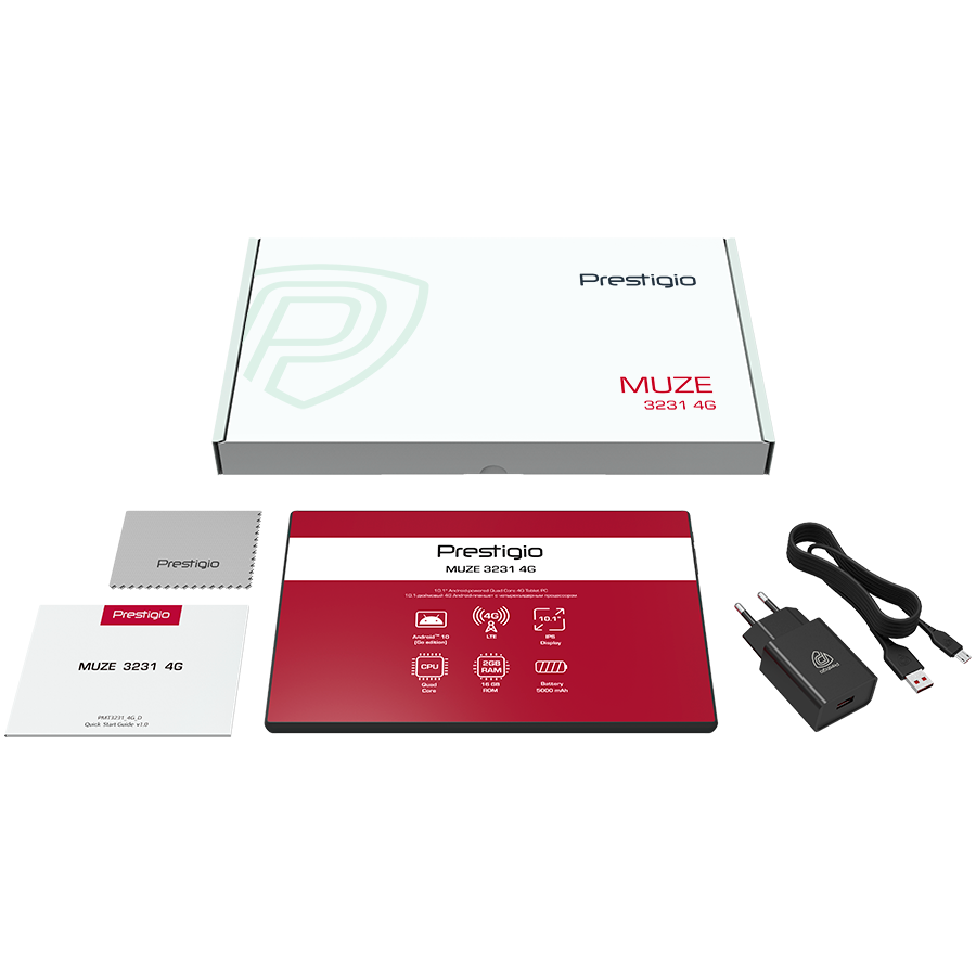 Prestigio Muze 3231 4G, 10.1"(1280*800) IPS, Android 10 (Go edition), up to 1.4GHz Quad Core Spreadtrum SC9832e CPU, 2GB + 16GB, BT 4.0, WiFi 802.11 b/g/n, 0.3MP front cam + 2.0MP rear cam, Micro USB, microSD card slot, LTE, Single SIM, have cal