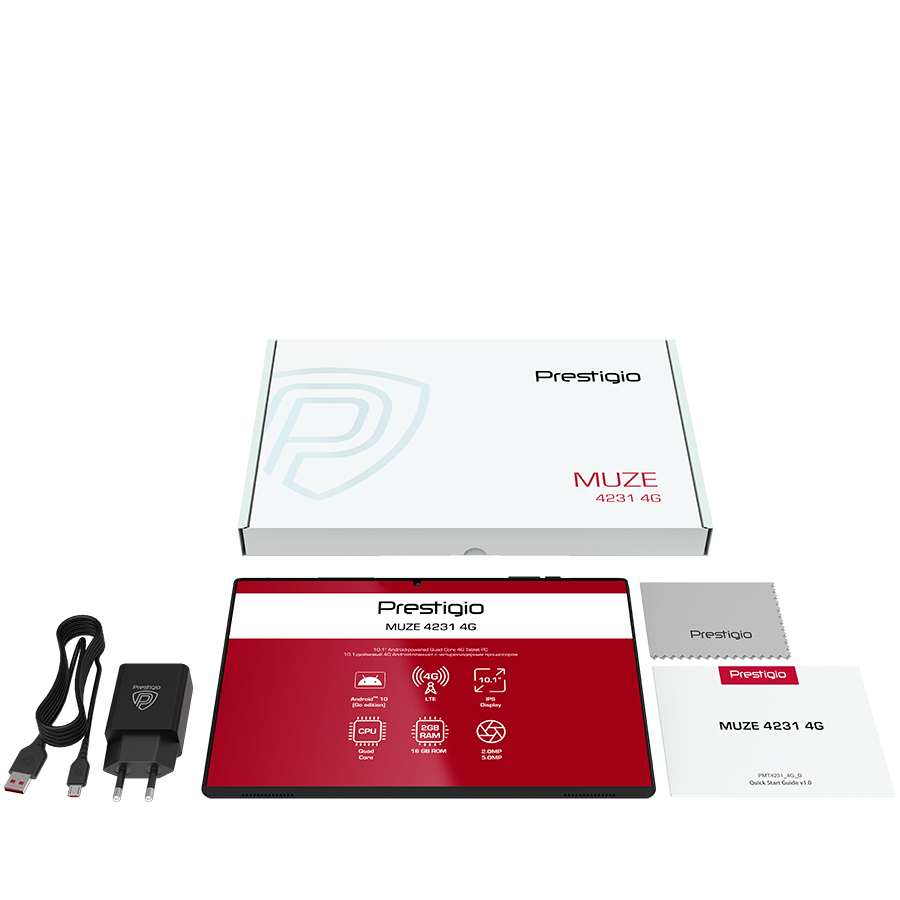 Prestigio Muze 4231 4G, 10.1"(1280*800) IPS, Android 10 (Go edition), up to 1.4GHz Quad Core Spreadtrum SC9832e CPU, 2GB + 16GB, BT 4.0, WiFi 802.11 b/g/n, 2.0MP front cam + 5.0MP rear cam, Micro USB, microSD card slot, LTE, Single SIM, have cal
