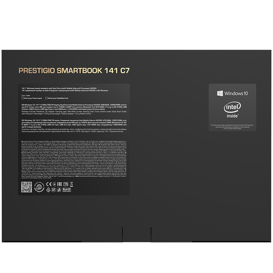 Prestigio SmartBook 141 C7, 14.1"(1366*768) TN, Windows 10 Home, up to 2.4GHz DC Intel Celeron N3350, 4/128GB, BT 4.2, WiFi 802.11 ac, USB 3.0, USB 2.0, USB-C, HDD 2.5" slot, MicroSD card slot, mini HDMI, 0.3MP cam, EN kbd, 7.4V@4800mAh bat