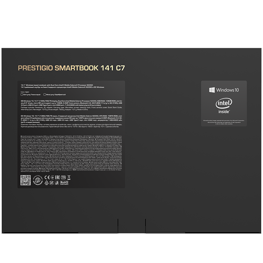 Prestigio SmartBook 141 C7, 14.1"(1366*768) TN, Windows 10 Home, up to 2.4GHz DC Intel Celeron N3350, 4/128GB, BT 4.2, WiFi 802.11 ac, USB 3.0, USB 2.0, USB-C, HDD 2.5" slot, MicroSD card slot, mini HDMI, 0.3MP cam, EN+RU kbd, 7.4V@4800mAh