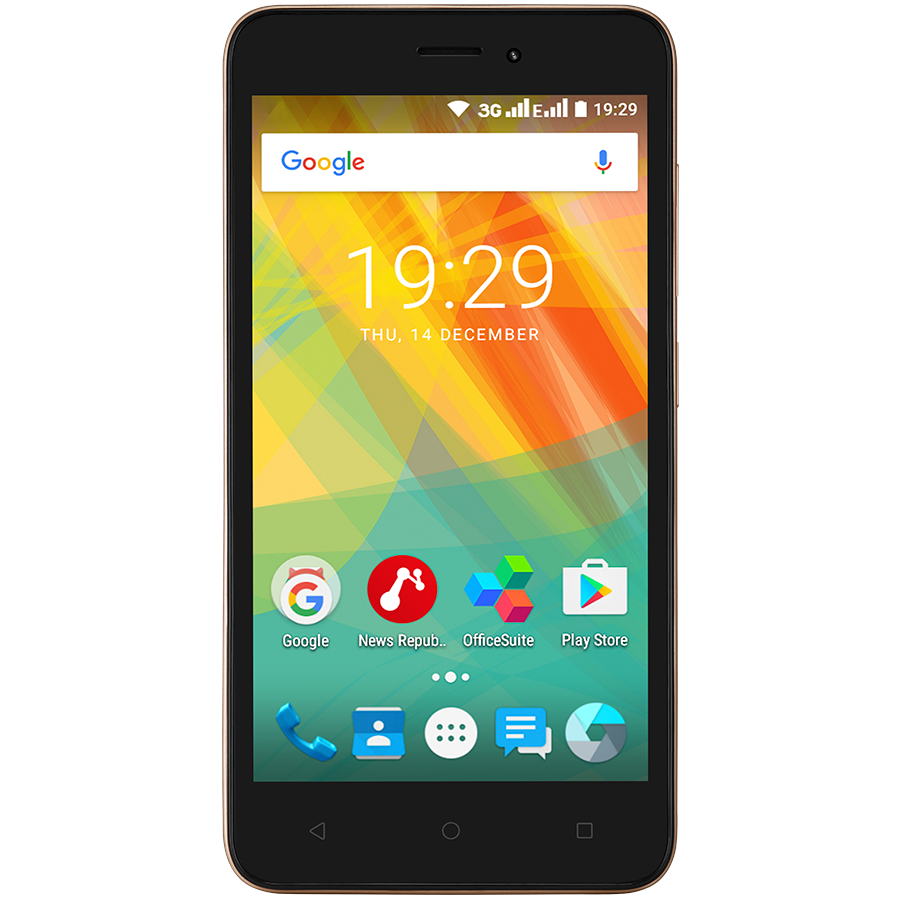 Prestigio Wize G3, PSP3510DUO, dual SIM, 3G, 5.0" (480*854) TN display, Android 6.0 Marshmallow, quad core 1.2GHz, 1GB RAM + 8GB eMMC, 0.3MP front + 5.0MP rear camera with LED-flash, 2000mAh battery, golden