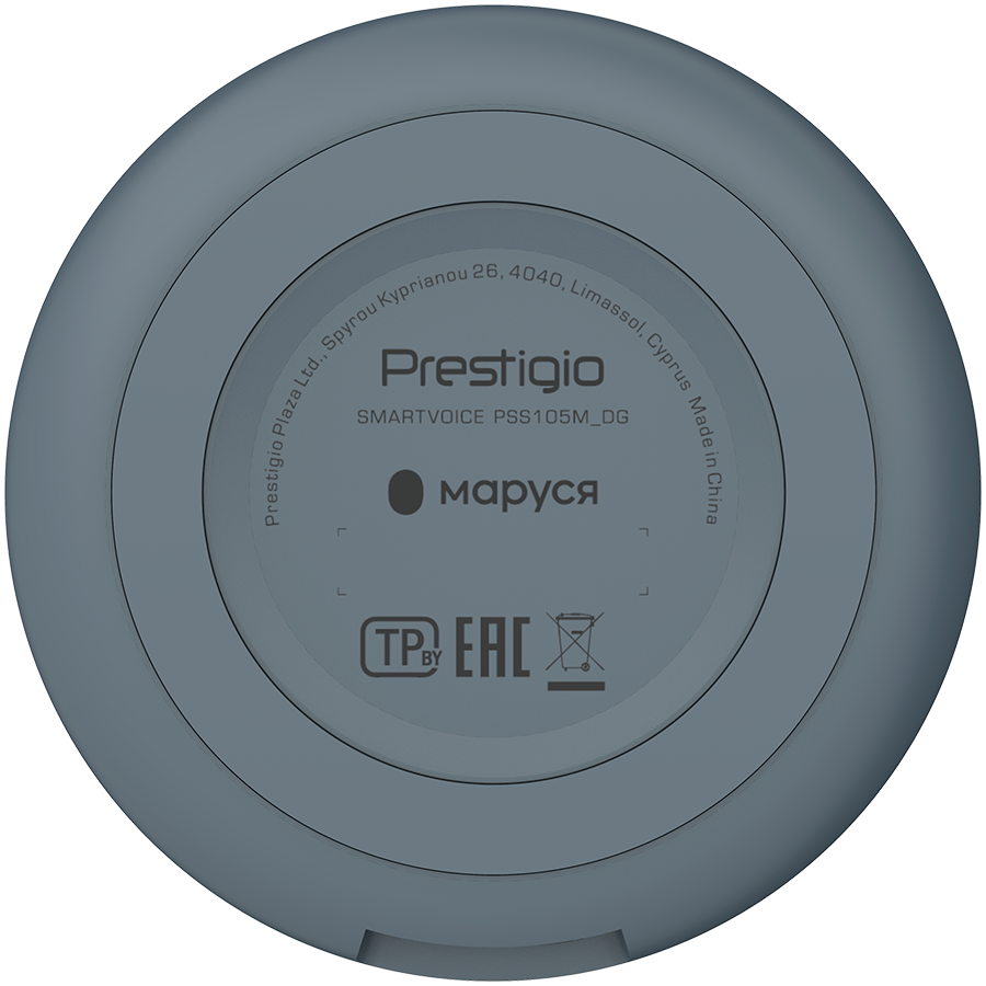 Prestigio SmartVoice, smart speaker with Marusia voice assistant, 1x3W sound power, 4 sensitive microphones, Wi-Fi/Bluetooth modes, AUX port, 3 month of VK Combo included, compact design, dark grey color.
