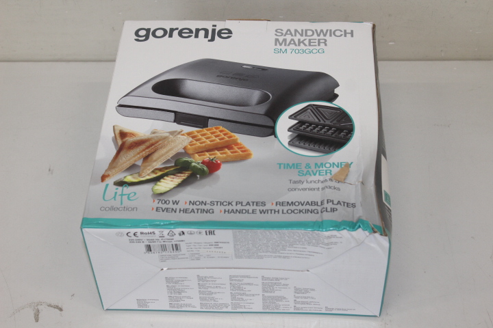SALE OUT. Gorenje SM703GCG Sandwich maker, Power 700 W, Removable plates, Number of plates - 3, Grey Gorenje Sandwich maker SM703GCG 700 W, Number of plates 3, Number of pastry 2, Grey, DAMAGED PACKAGING