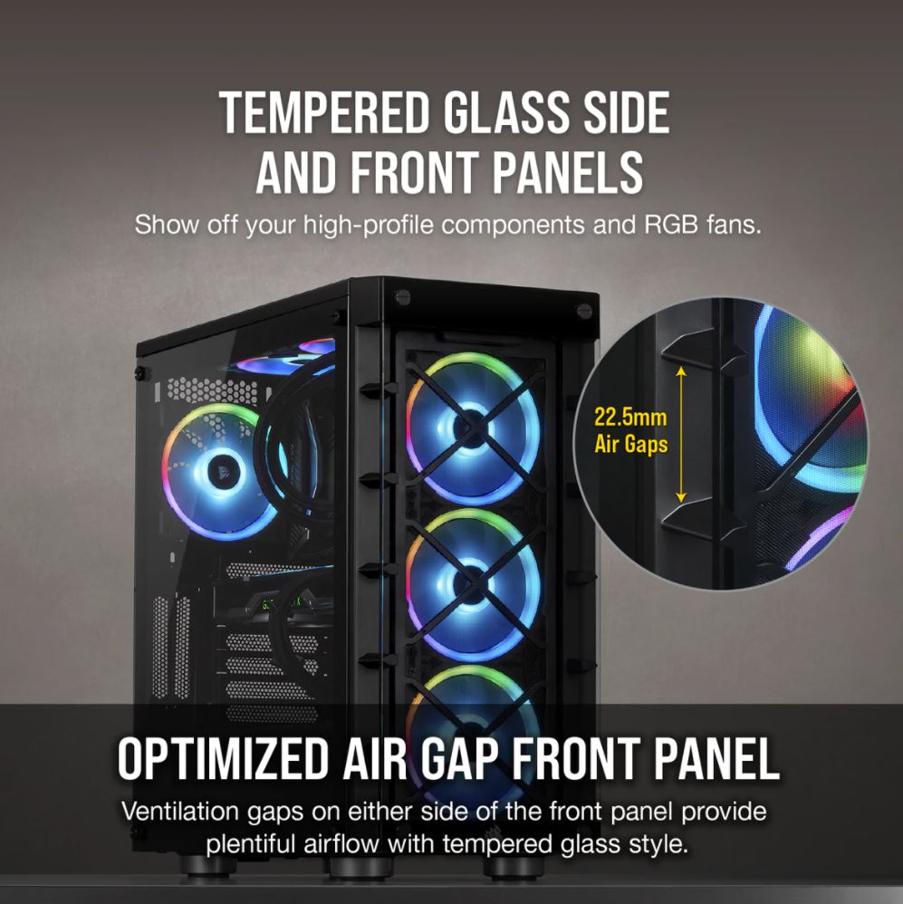 The included iCUE Lighting Node CORE controls up to 6x RGB fans without the need for a fan hub, enabling brilliant lighting effects right out of the box with CORSAIR iCUE software; Up to 6x120mm cooling fans or multiple radiators in sizes up to 360mm" |