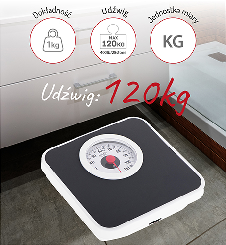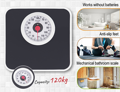 Klasyczna, mechaniczna waga łazienkowa. Jeśli nie ufasz wyświetlaczom, z jakichś przyczyn ich nie lubisz lub po prostu nie pasują do Twojej łazienki, wybierz wagę mechaniczną AD 8178. Nie musisz jej włączać, po prostu stajesz i odczytujesz wynik - a