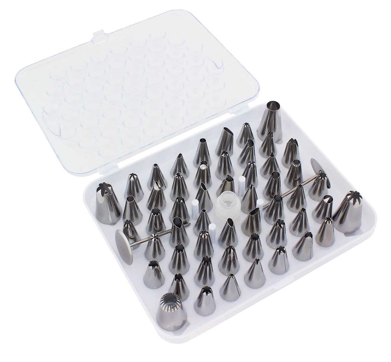 Doskonały zestaw do dekorowania tortów i ciast składający się z aż 54 różnorodnych, stalowych końcówek (tylek cukierniczych) oraz pinezek. Z ich pomocą pięknie udekorujesz torty, ciasta oraz talerze na kt&