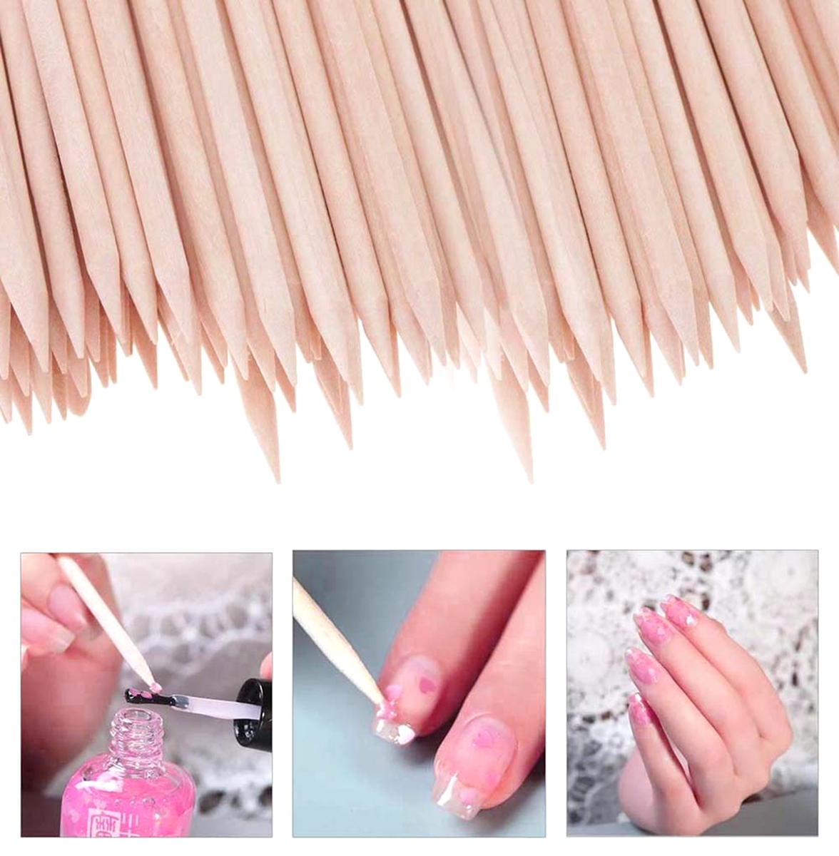 Drewniane patyczki kosmetyczne niezbędne dla każdego kto wykonuje manicure. Odsuwanie skórek umożliwia pielęgnację i zdobienie płytki paznokci oraz zwykle niedostępnych obszarów paznokcia.W zestawie oferujemy aż 100 szt. patyczków!Cechy i specyfikacj