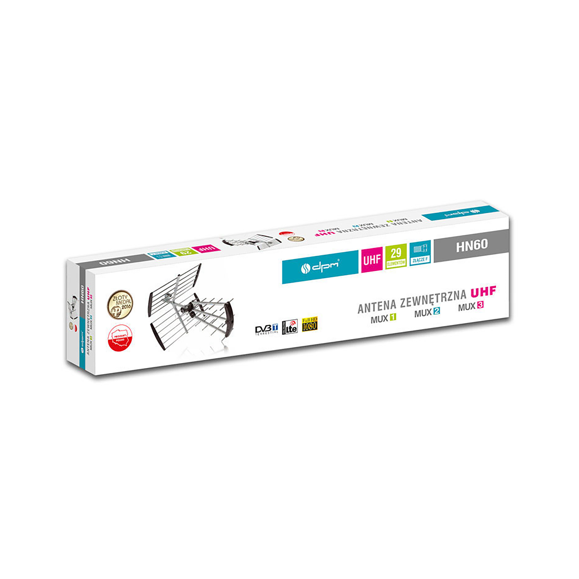 ----------Specyfikacja techniczna----------Pasmo odbioru: UHFFiltr LTE: takObszar zastosowania: zewnętrznyMateriał: aluminiowyPolaryzacja: pionowa i poziomaKolor:szary----------Cechy----------Antena zewnętrzna TV odbiera cyfrową telewizję DVB-T w pas