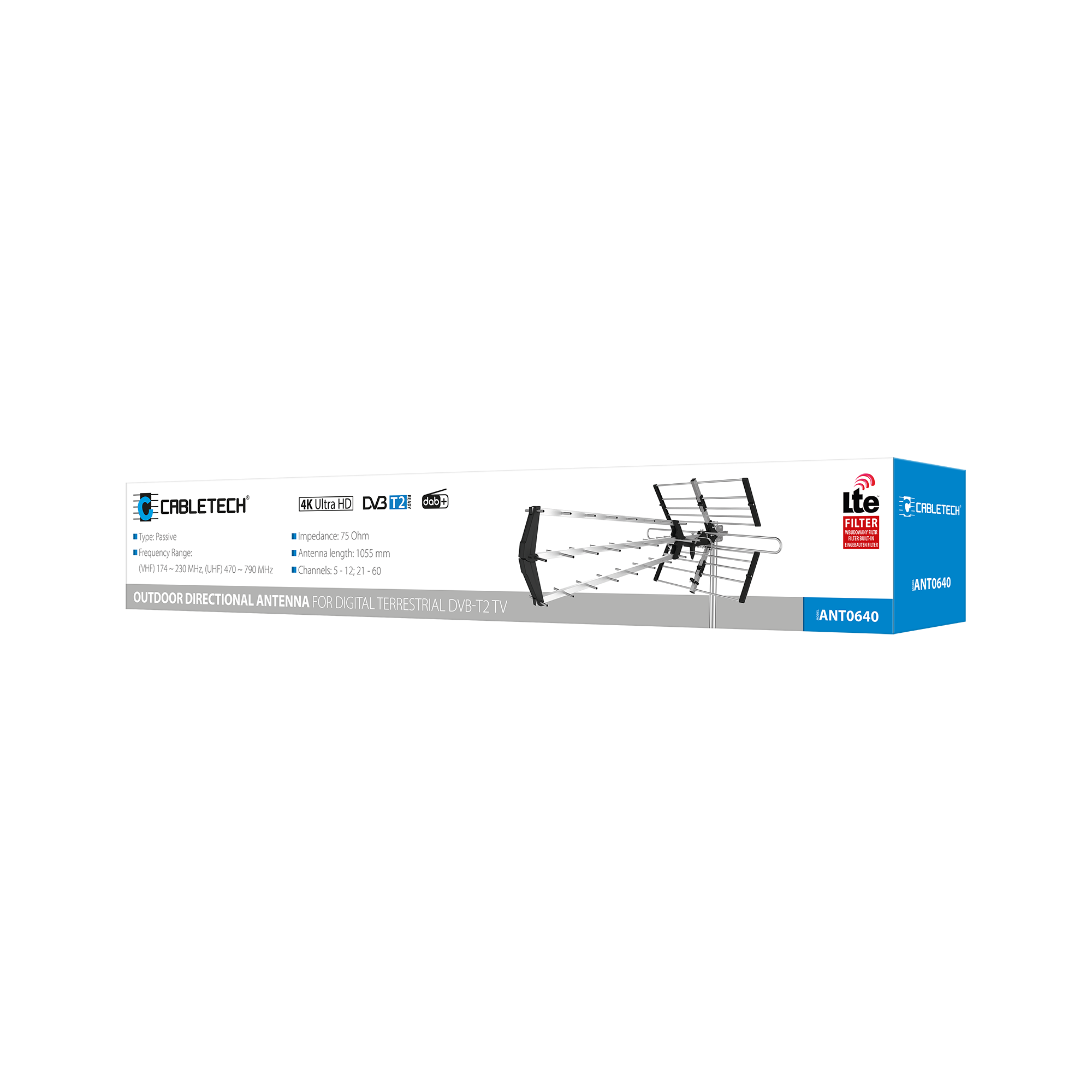 Antena kierunkowa do cyfrowej telewizji naziemnej DVB-T2 CabletechZewnętrzna antena TV kierunkowa Cabletech to urządzenie, które umożliwia odbiór naziemnej telewizji cyfrowej DVB-T i DVB-T2 z dużych odległości nawet w tr