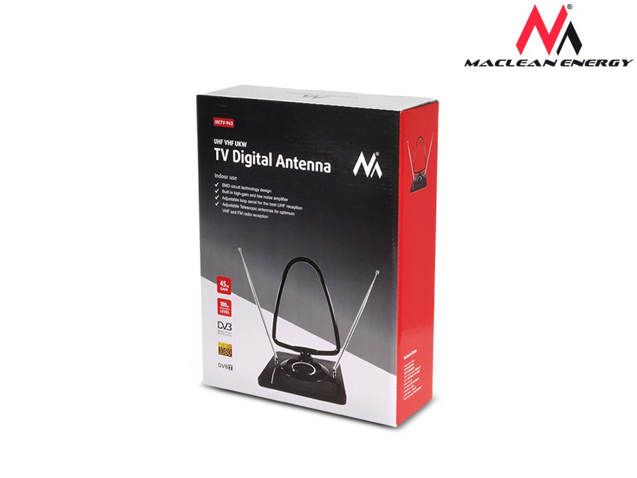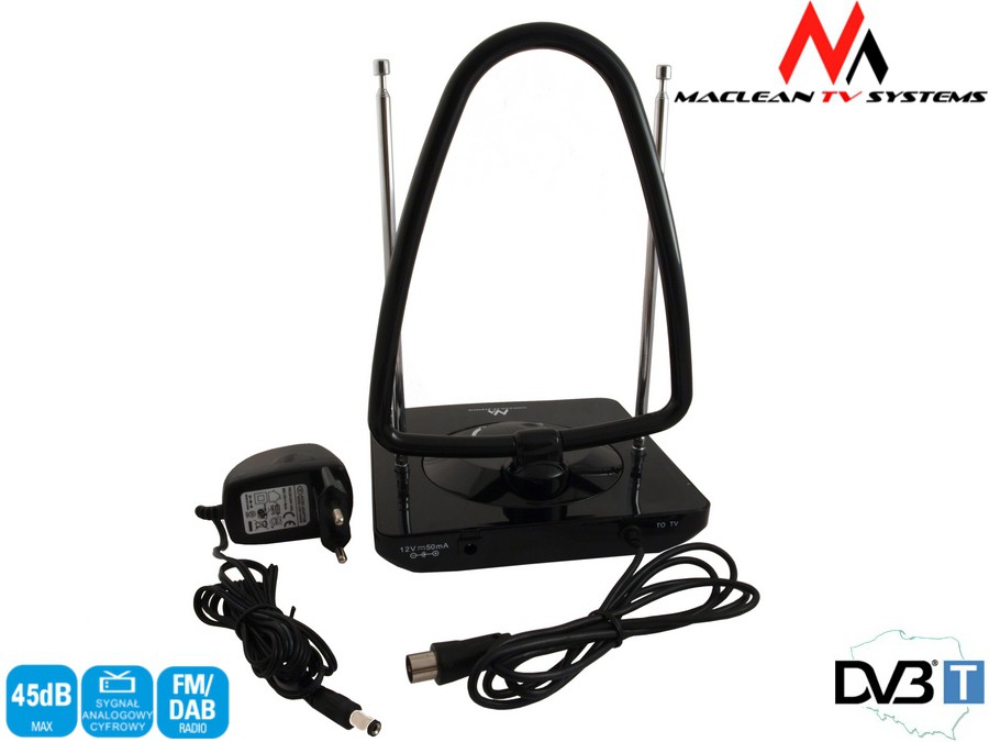 Antena TV Radio DVB-T pokojowa Maclean MCTV-963Antena pokojowa ze wzmacniaczem UHF/VHF/FM Parametry: wzmocnienie 45dB - regulowanezakres częstotliwości 40 - 862 MHzwzmocnienie VHF - 36dBwzmocnienie UHF - 45dBimpedancja 75Ωzasilanie 12