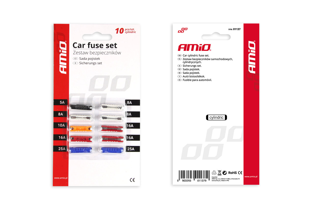 Wysokiej jakości zestaw bezpieczników samochodowych cylindrycznych chroniący instalacje elektryczne pojazdów przed ich uszkodzeniem. Typ bezpiecznika: cylindryczne Zawartość zestawu: 5A, 2x8A, 2x10A, 2x16A, 20A, 2x25A Ilość sztuk w opakowaniu: 10 szt