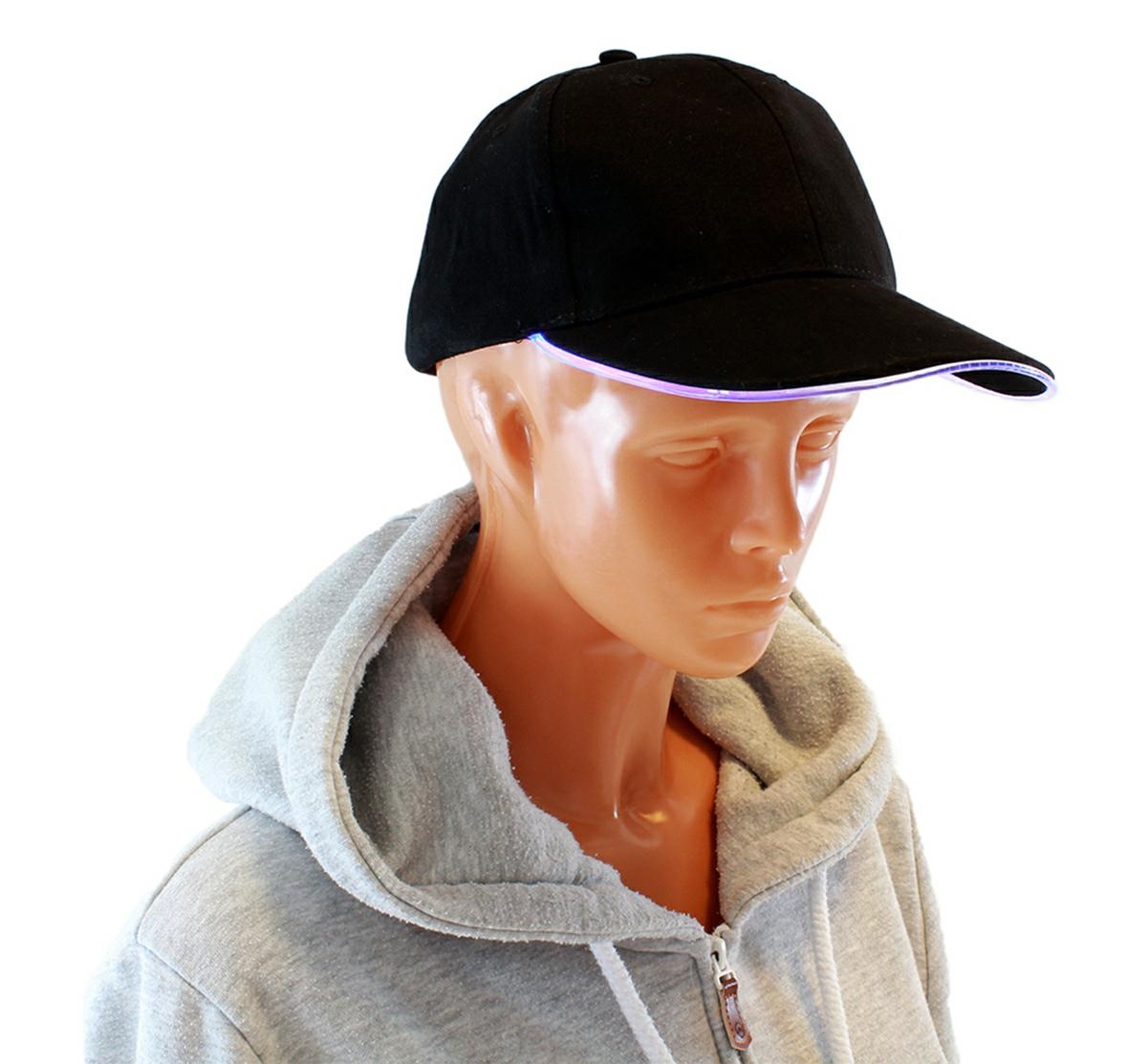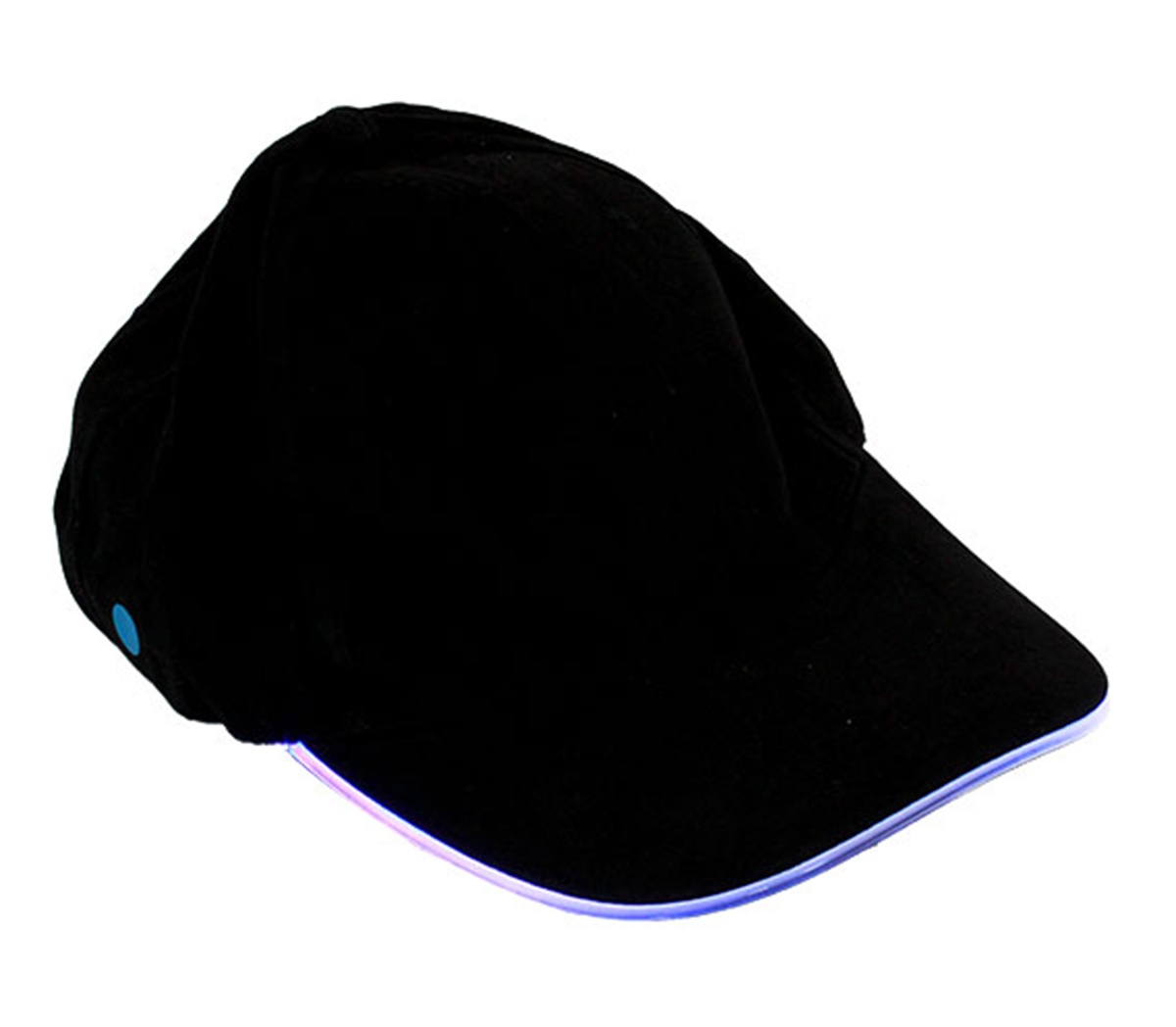 Czapka z daszkiem / bejsbolówka wyposażona diody LED emitujące niebieskie światło. Doskonały gadżet ułatwiający wieczorne wędrówki bez zajmowania sobie rąk klasyczną latarką. Dobra i energooszczędna alternatywa dla ciężk