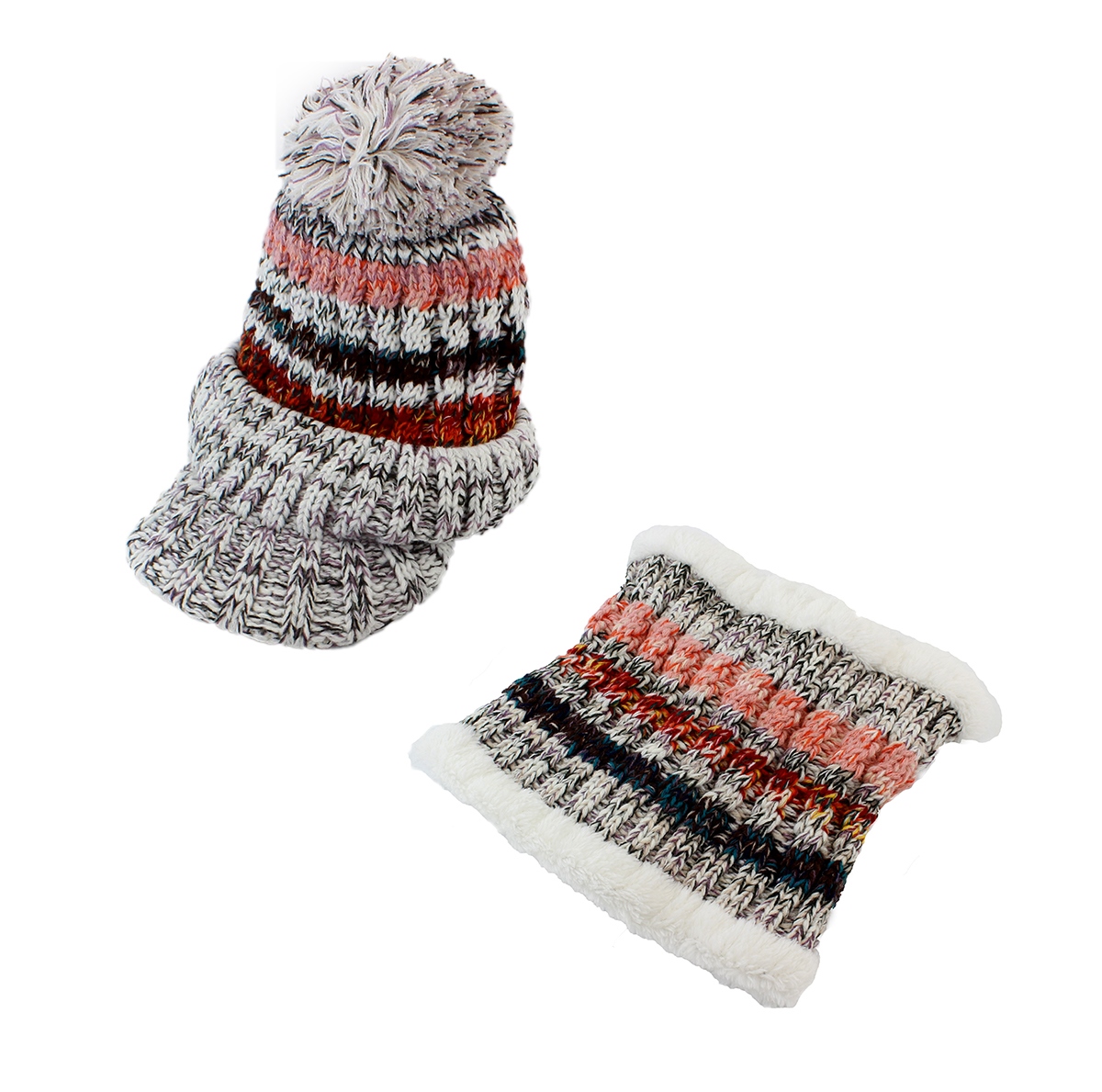 Ponadczasowy, damski zestaw zimowy - czapka z daszkiem i komin! Gwarantuje przeżycie w trudnym klimacie tundry oraz siarczystych mrozów na naszym gruncie. Wykonany z ciepłego i miłego w dotyku materiału. Czapka z daszkiem chroni głowę
