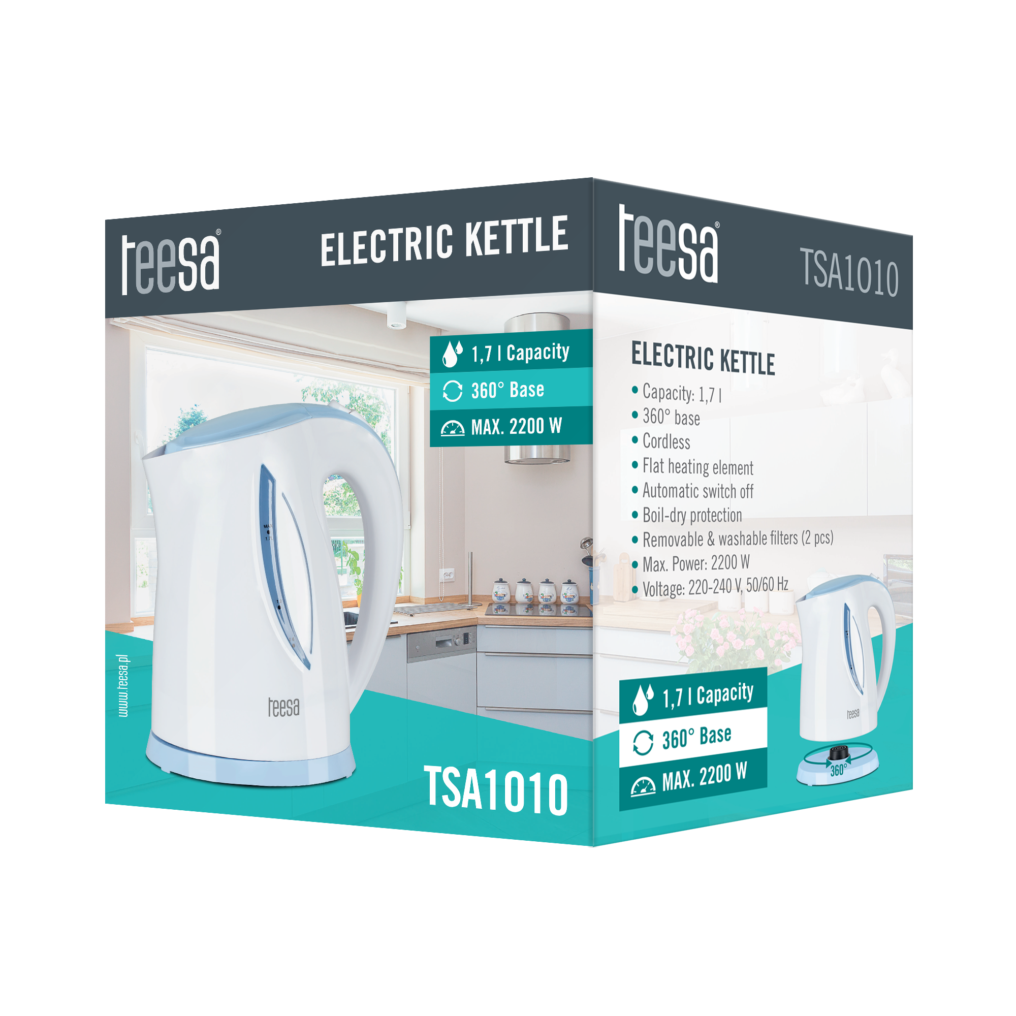 TSA1010 to poręczny czajnik bezprzewodowy, którego pojemność wynosi 1,7 l. Urządzenie, dzięki białej obudowie z niebieskimi elementami wykończenia idealnie wkomponuje się w wystrój każdej kuchni, a wysokiej jakości tworz
