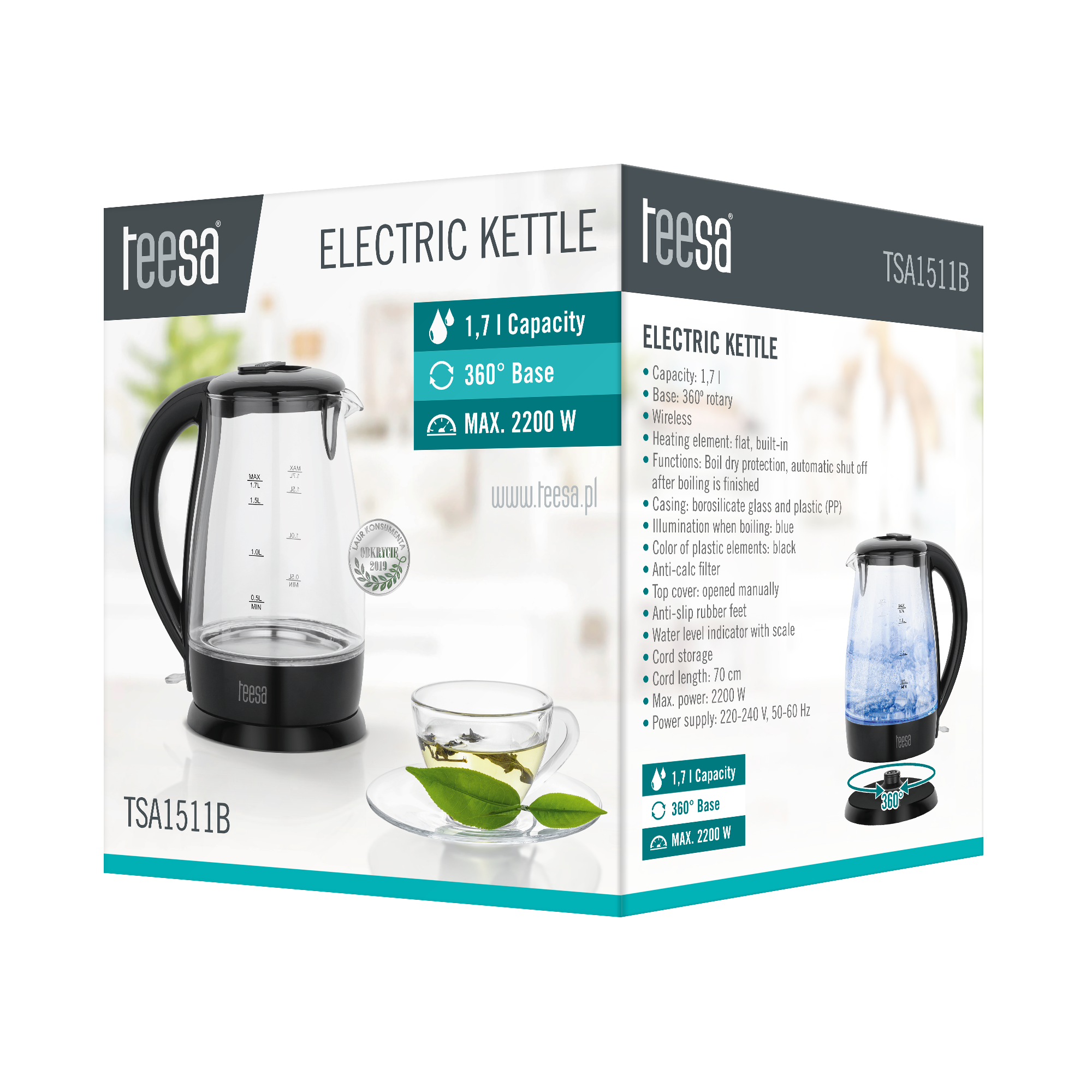 Bezprzewodowy czajnik elektryczny TSA1511BZastanawiasz się jaki czajnik elektryczny wybrać? Polecamy TSA1511, którego design przypadnie do gustu każdemu, kto ceni nowoczesność. Przeszklenie w połączeniu z niebieskim podświetleniem, kt&