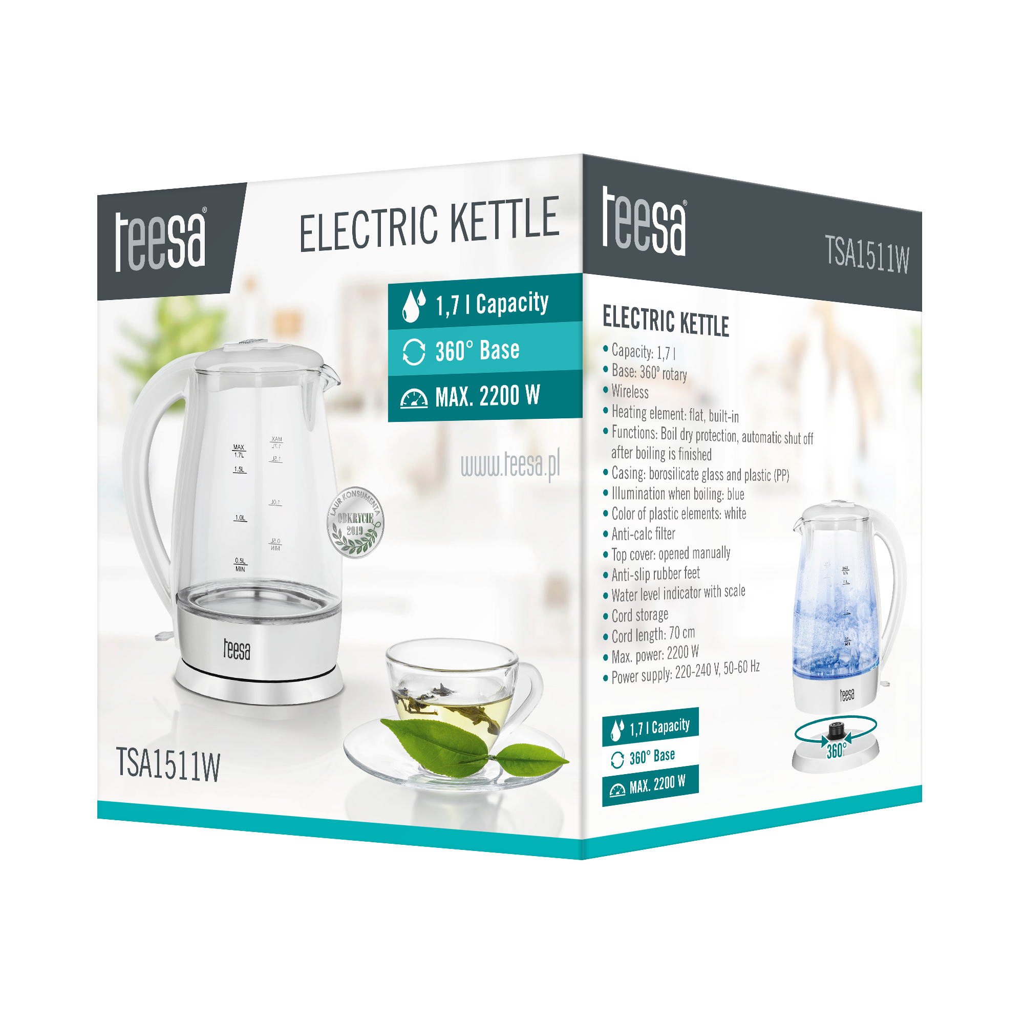Bezprzewodowy czajnik elektryczny TSA1511WZastanawiasz się jaki czajnik elektryczny wybrać? Polecamy TSA1511, którego design przypadnie do gustu każdemu, kto ceni nowoczesność. Przeszklenie w połączeniu z niebieskim podświetleniem, kt&