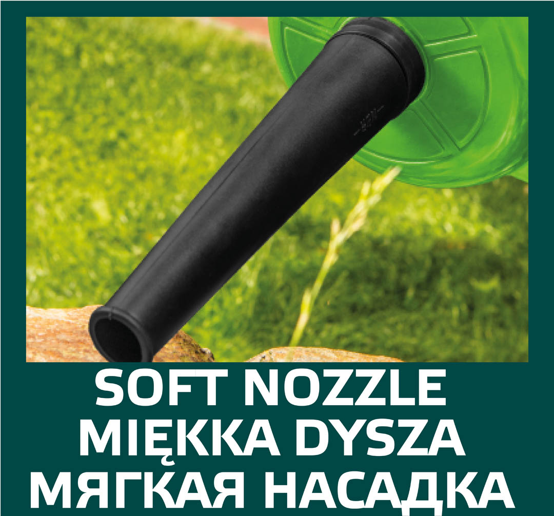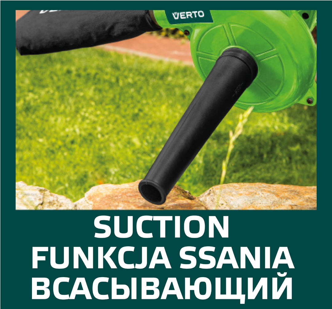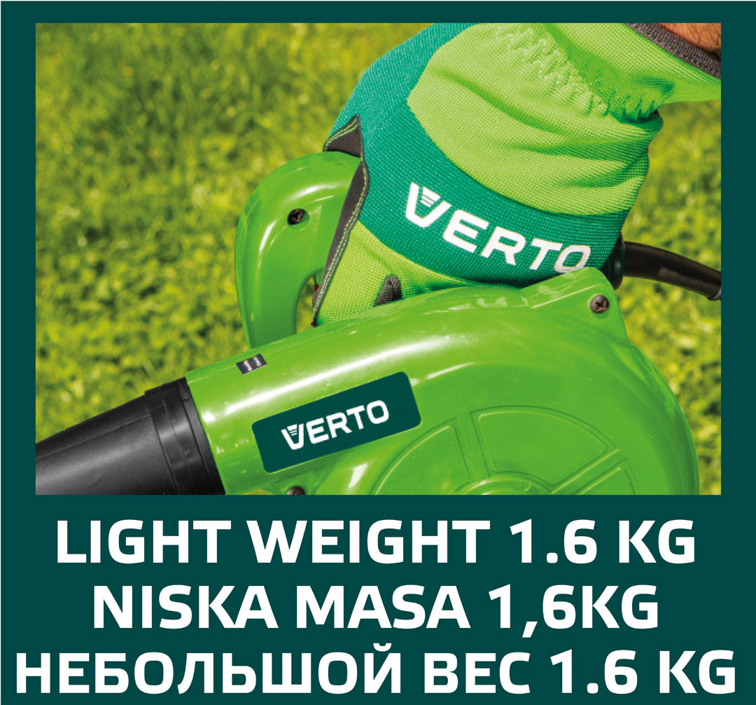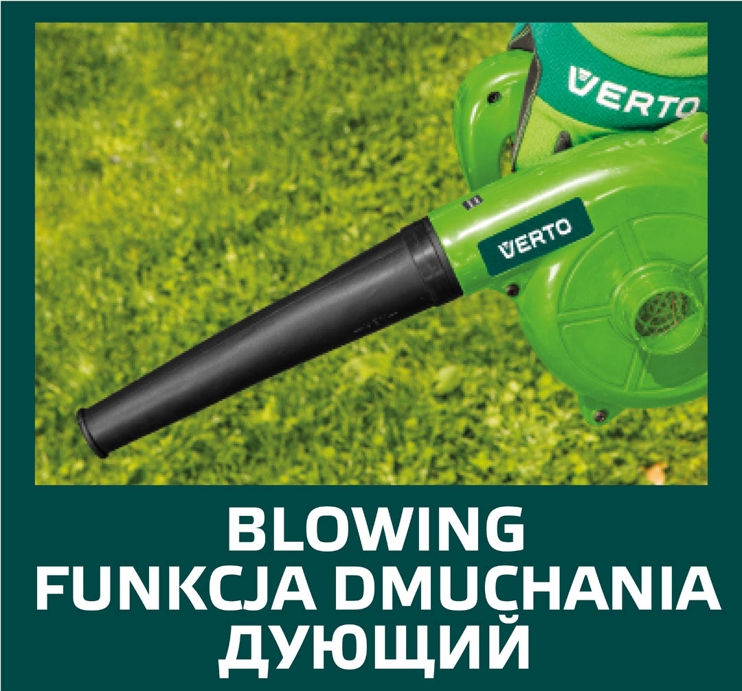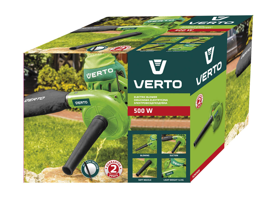 Dmuchawa elektryczna 500W, obroty 16000 min, wydatek powietrza 2.2 m3/min, pojemność worka 0.6 l, (LxHxW) 410 x 210 x 180 mm, masa 1.5 kg